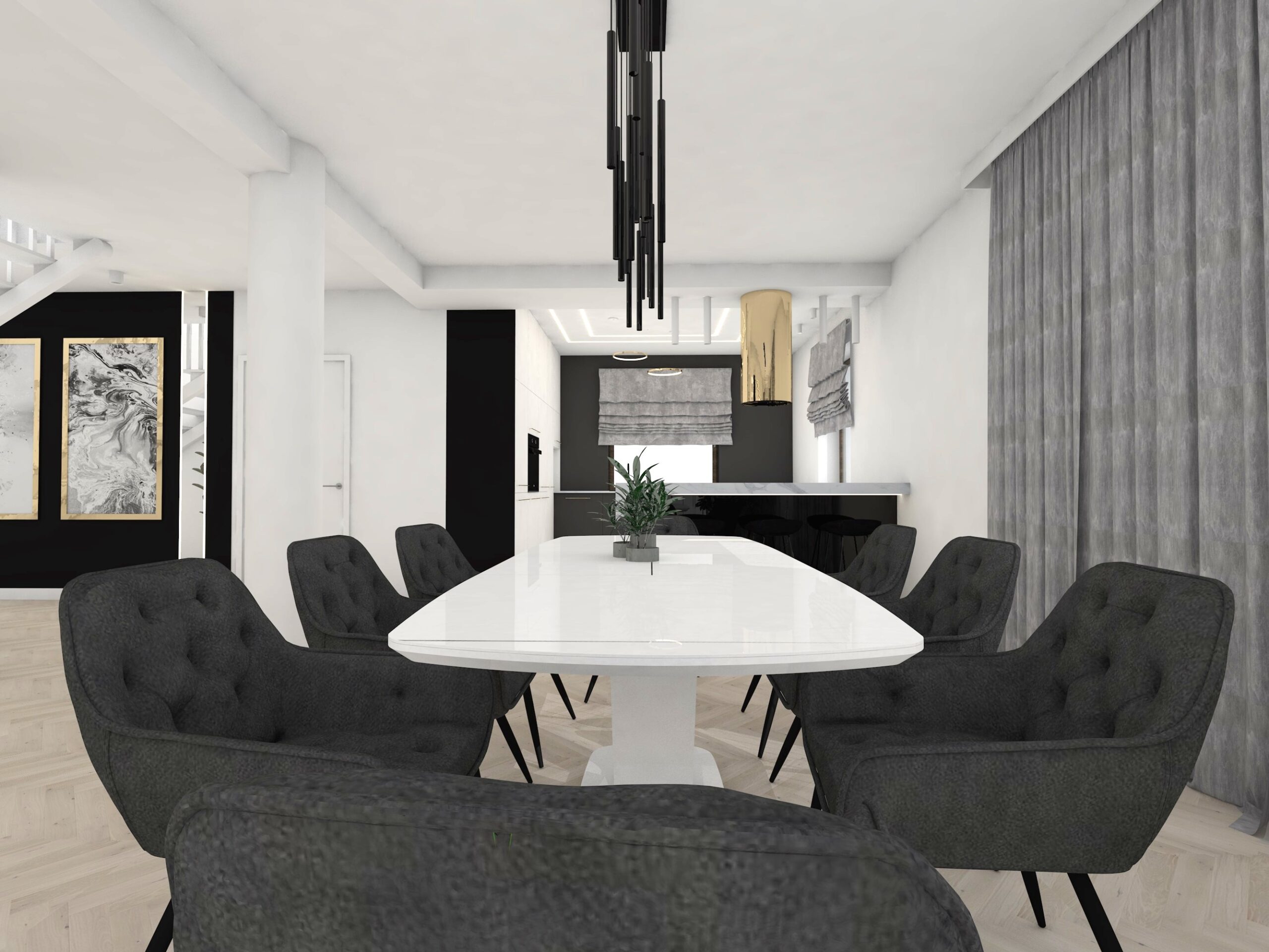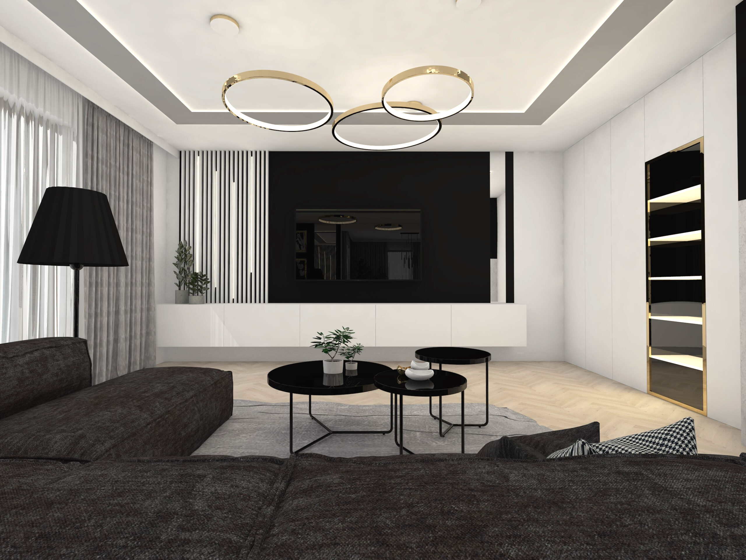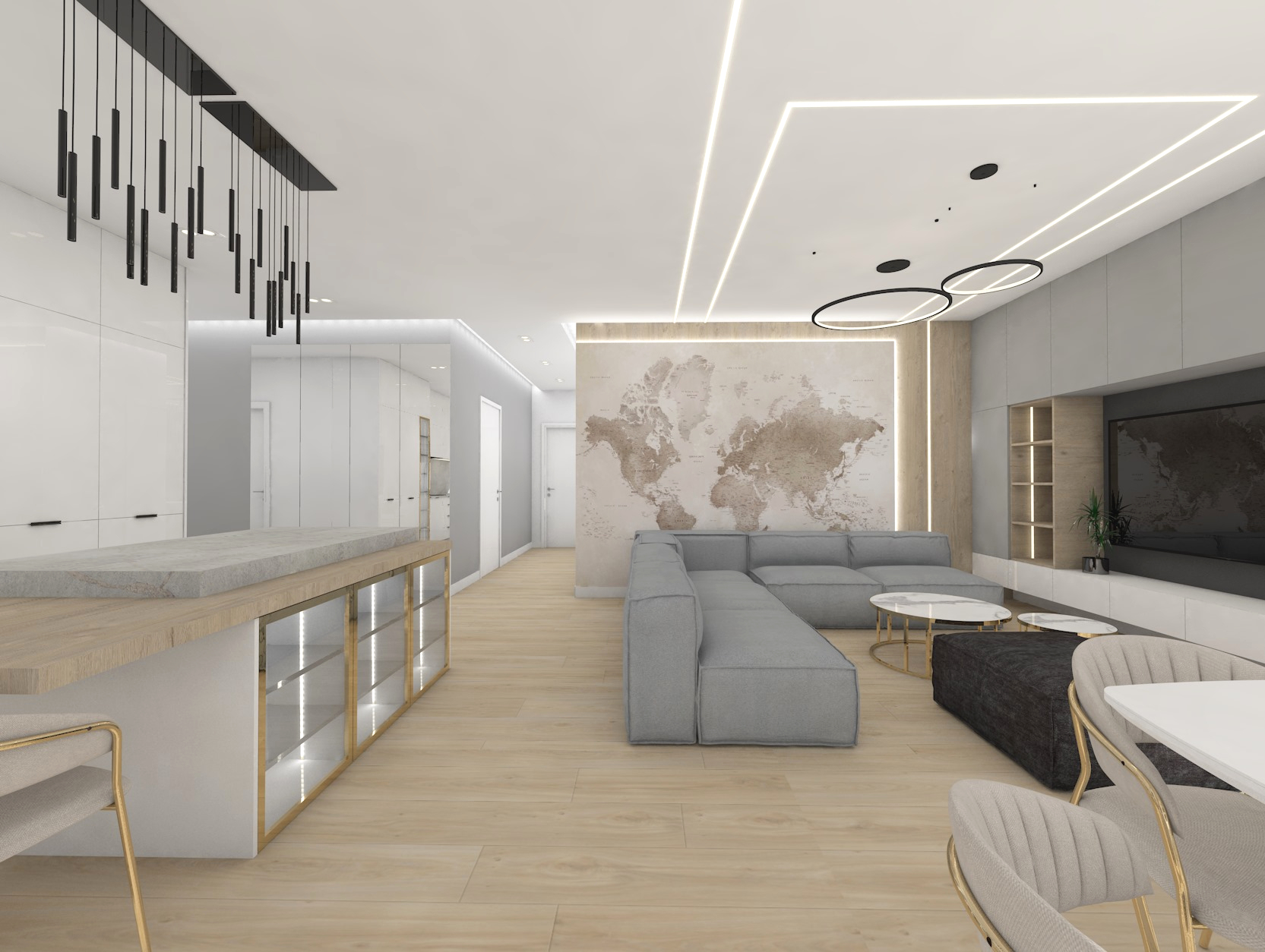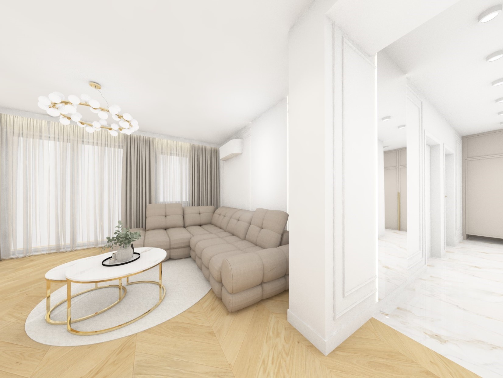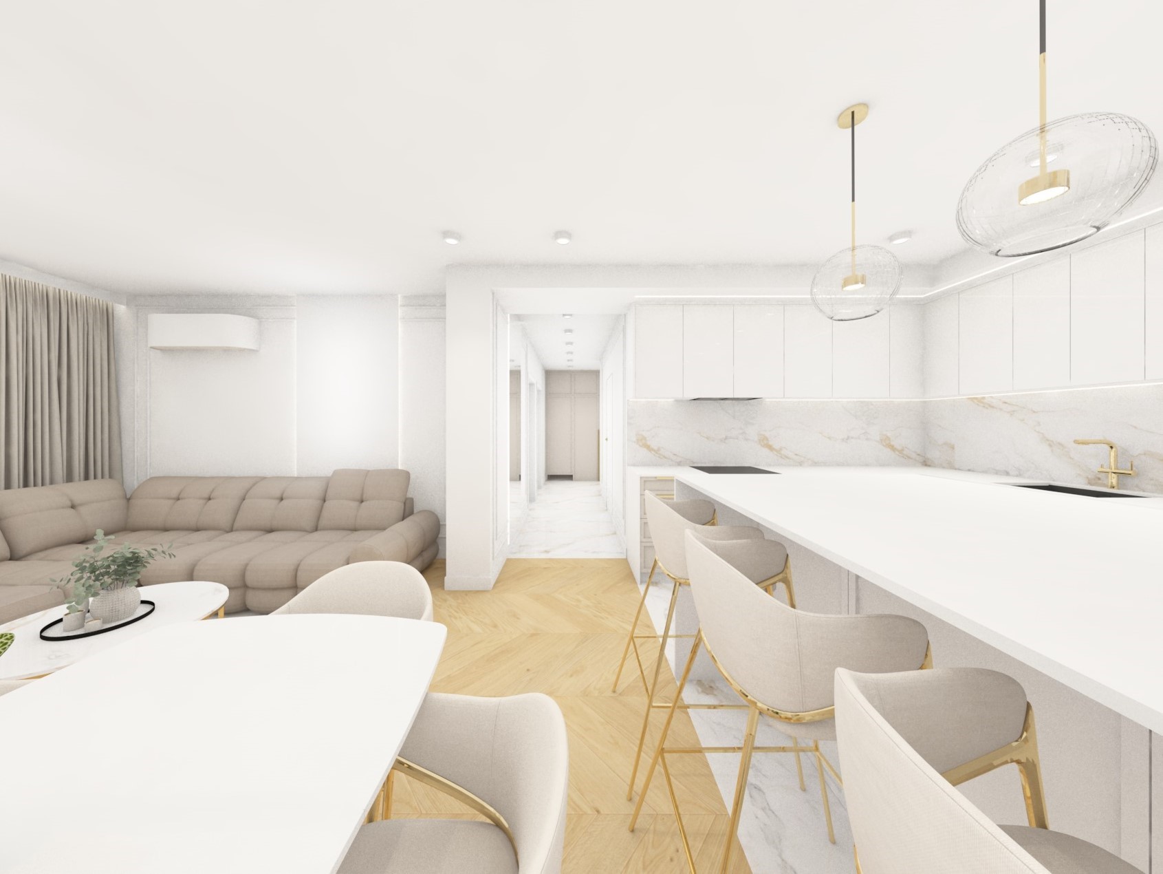 Projekt strefy dziennej w stonowanej kolorystyce ze złotymi dodatkami oraz ciemniejszym akcentem w strefie wejścia