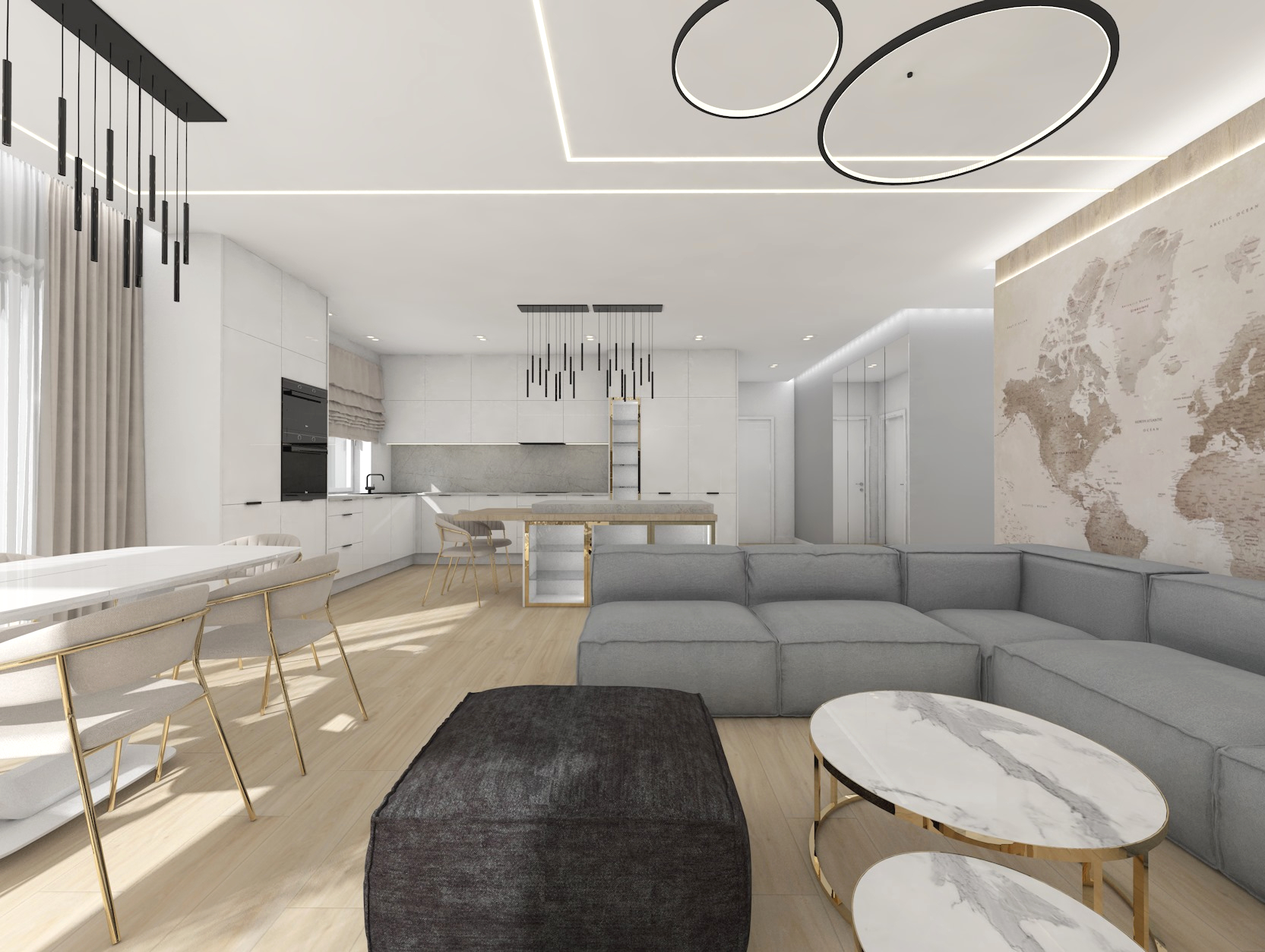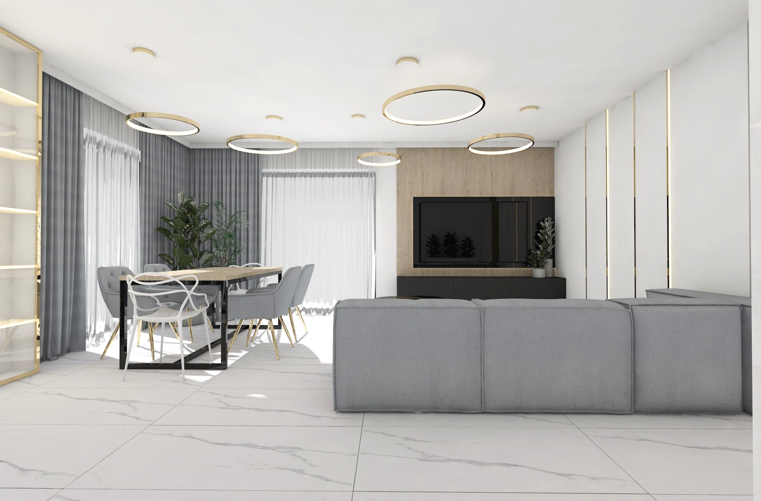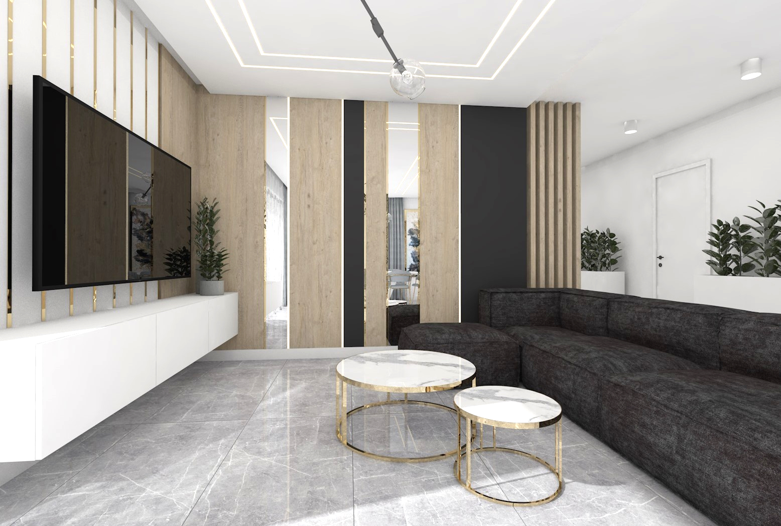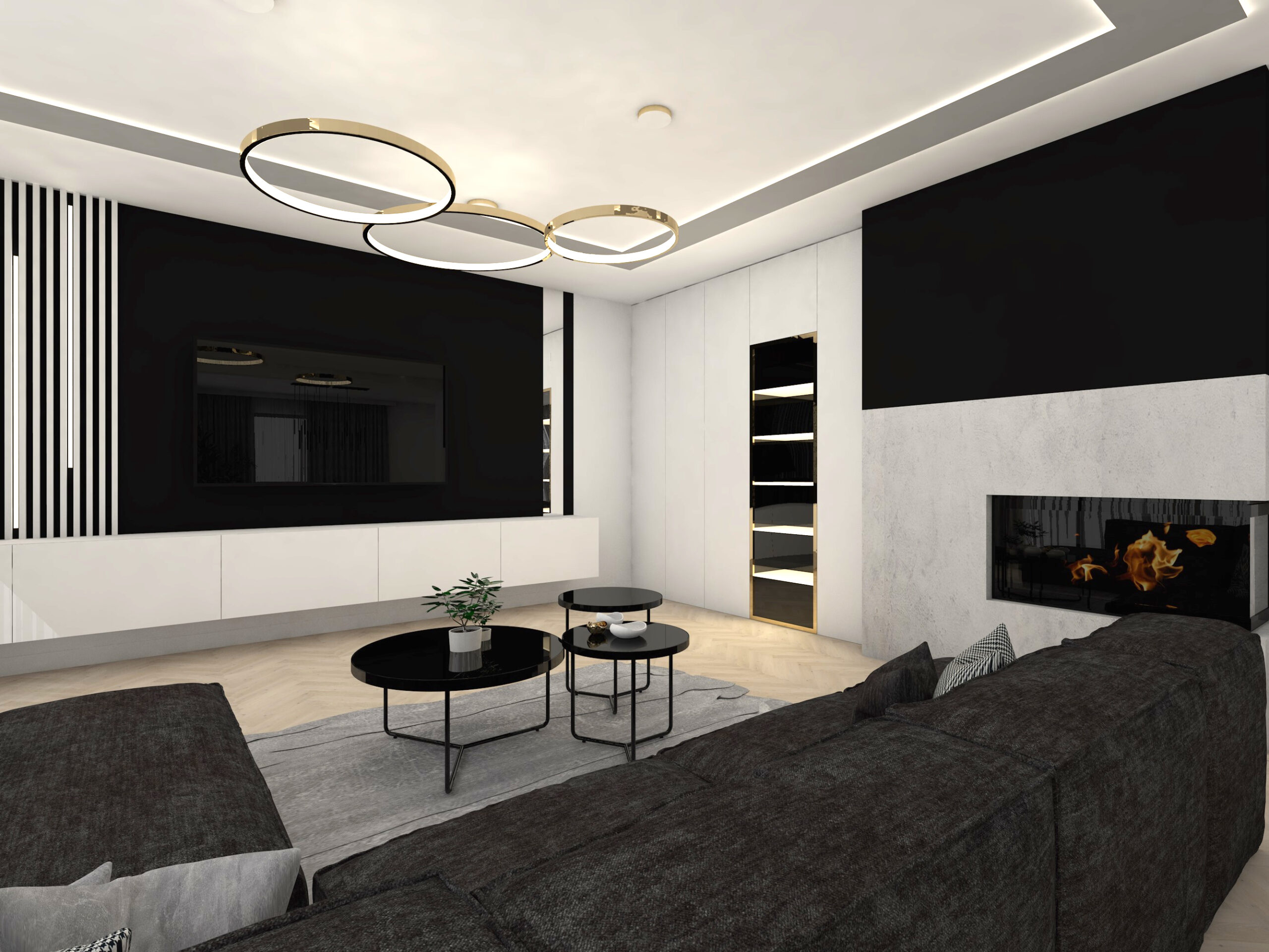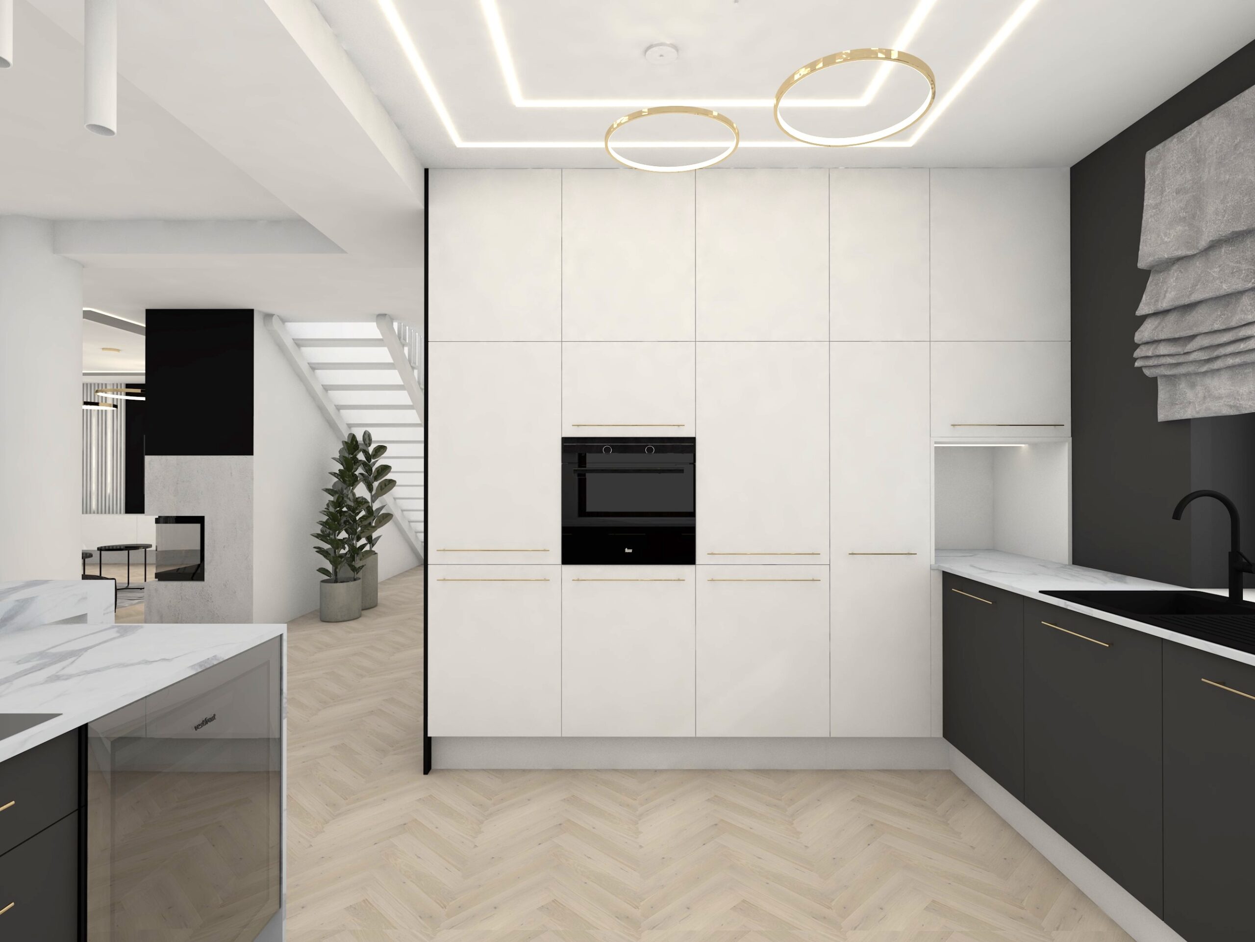 Projekt strefy dziennej w stonowanej kolorystyce ze złotymi dodatkami oraz ciemniejszym akcentem w strefie wejścia