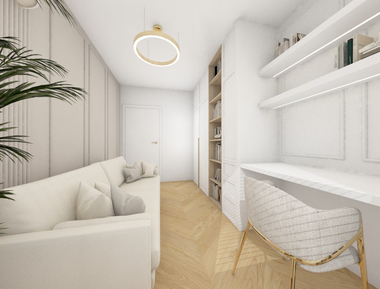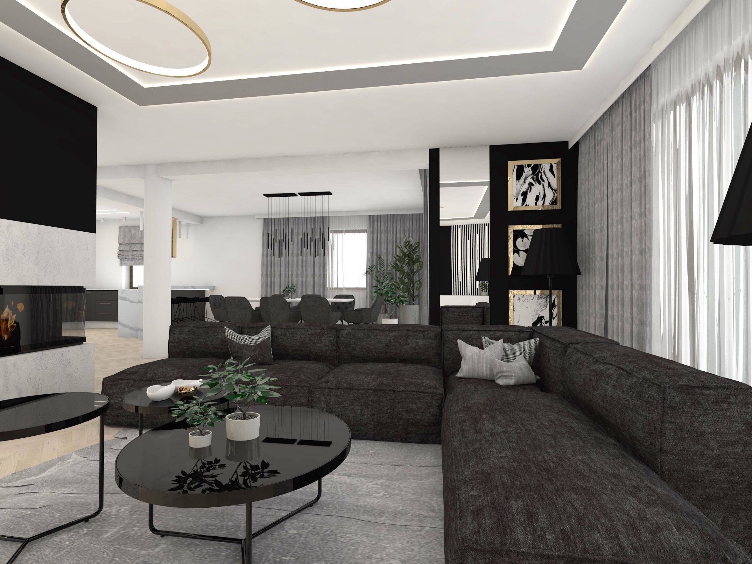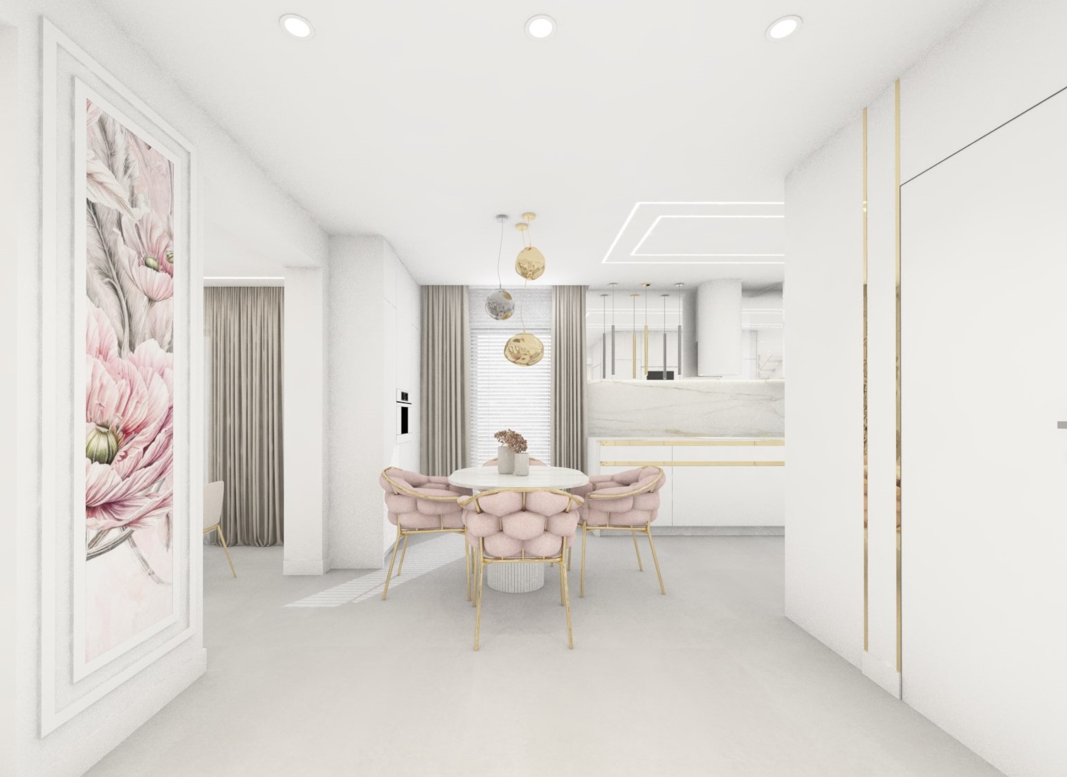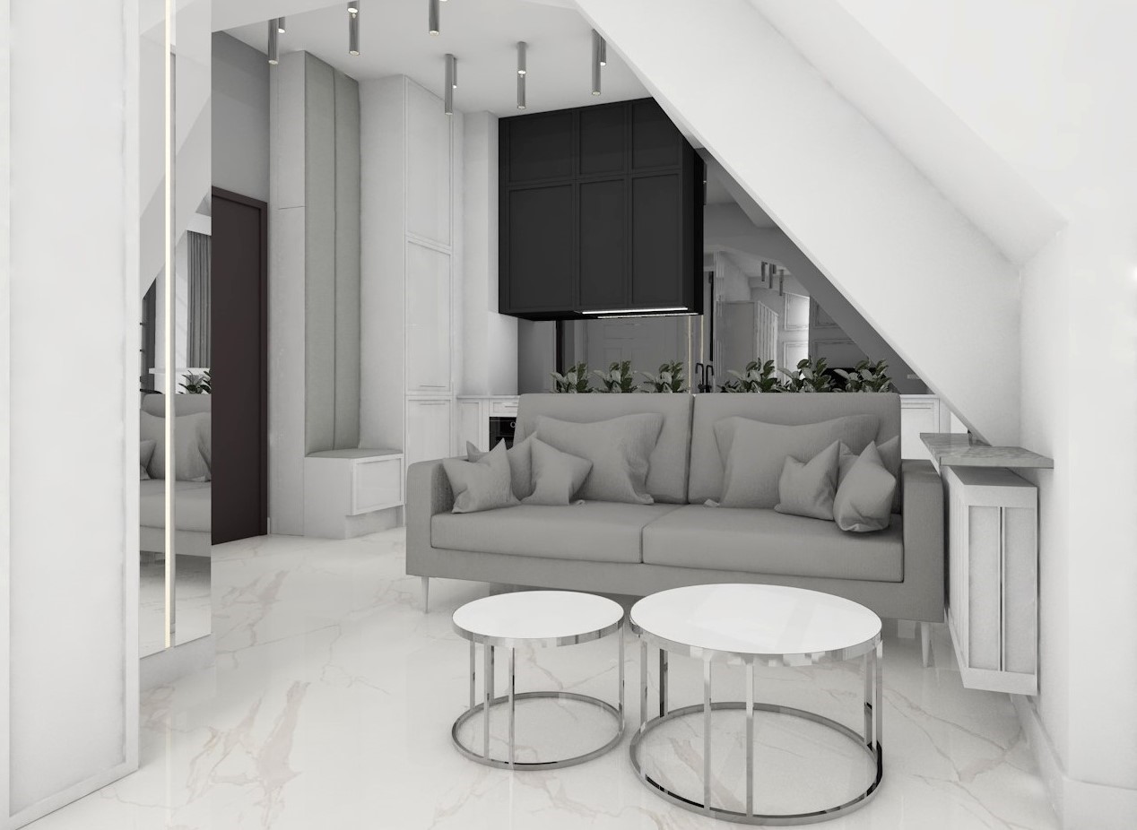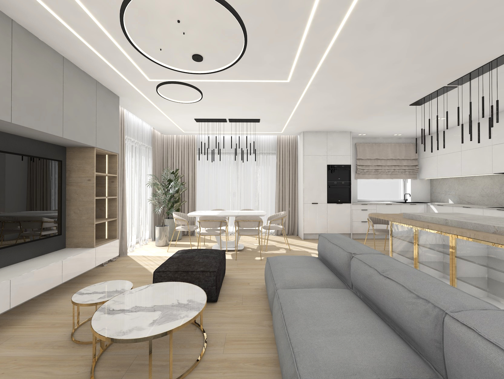 Projekt strefy dziennej w stonowanej kolorystyce ze złotymi dodatkami oraz ciemniejszym akcentem w strefie wejścia