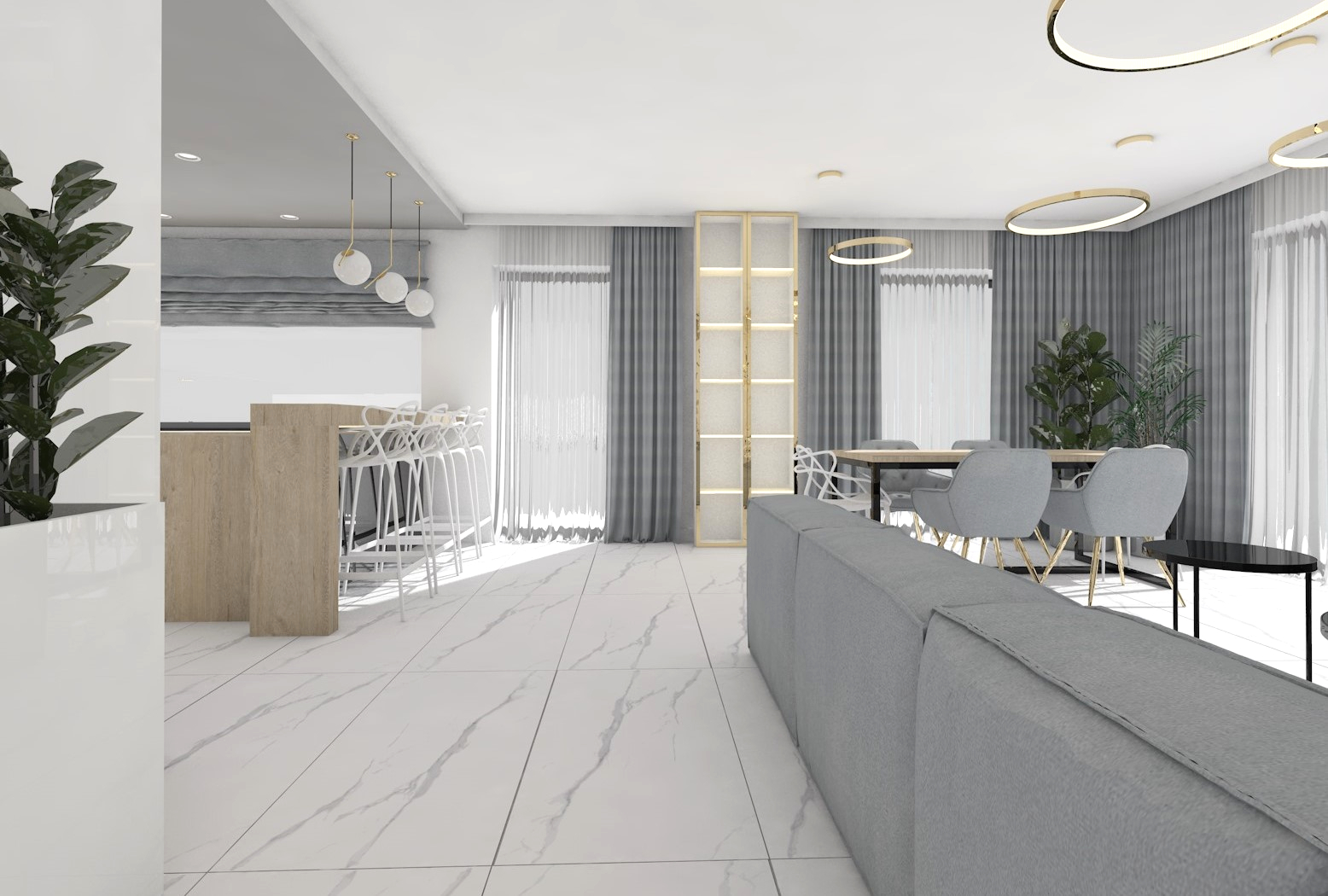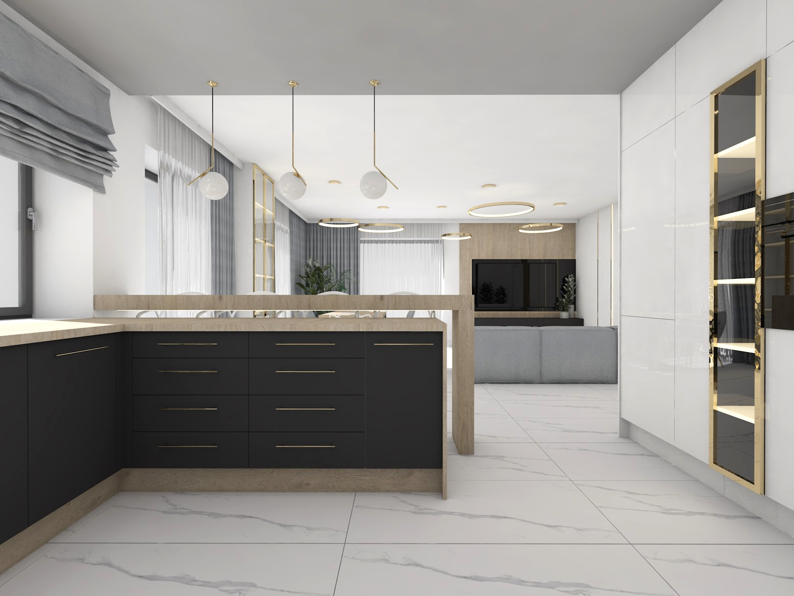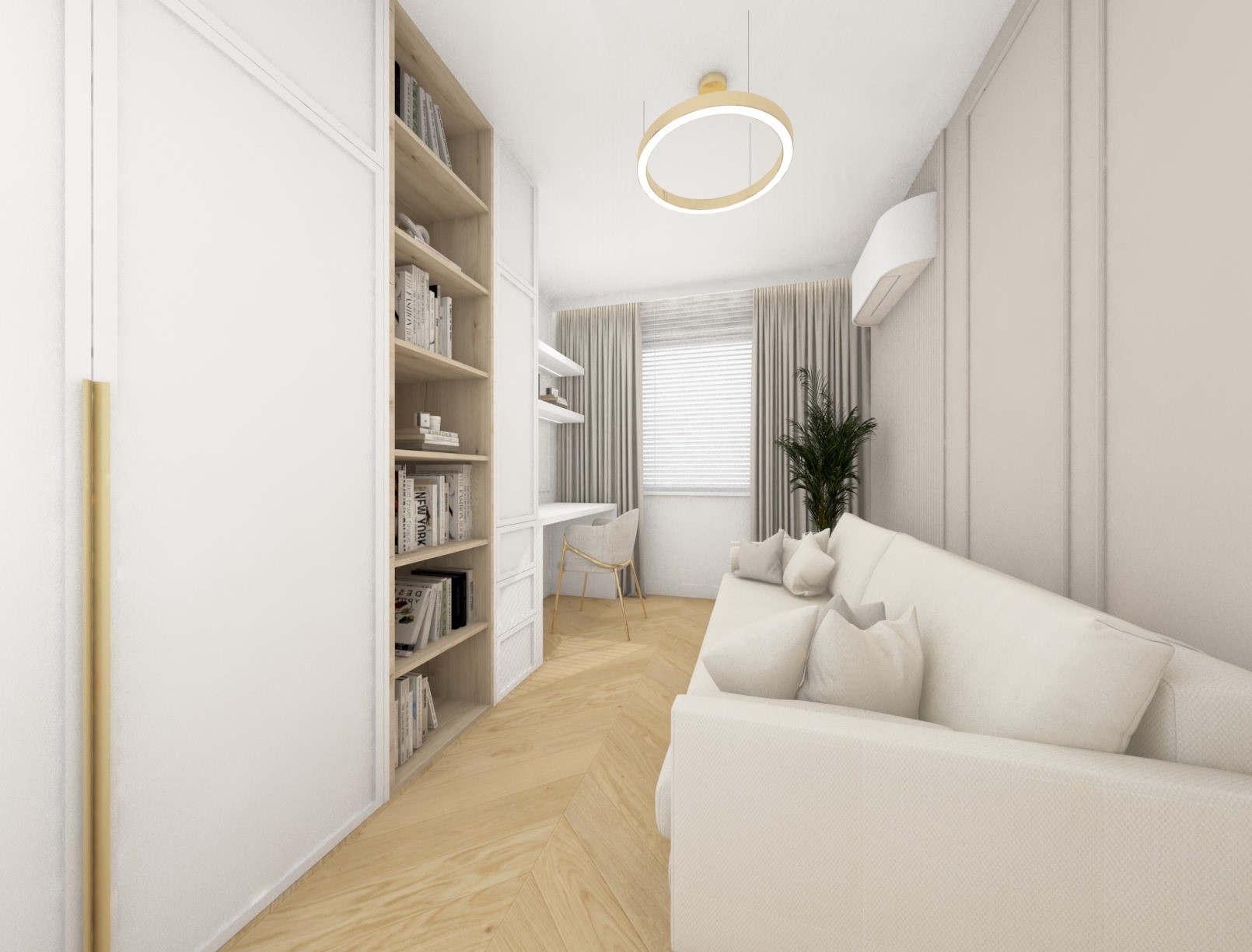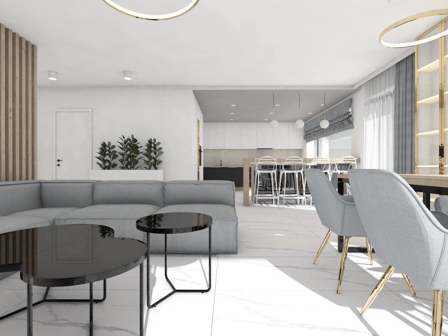 Projekt strefy dziennej w stonowanej kolorystyce ze złotymi dodatkami oraz ciemniejszym akcentem w strefie wejścia