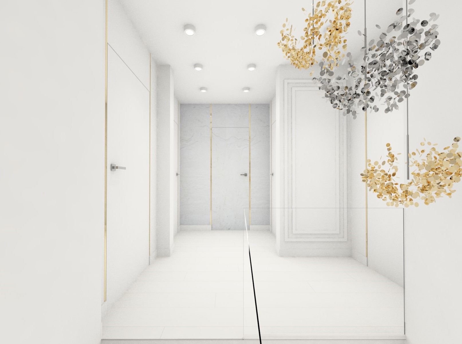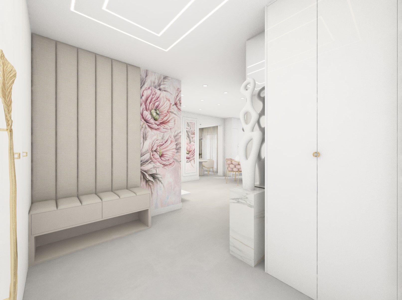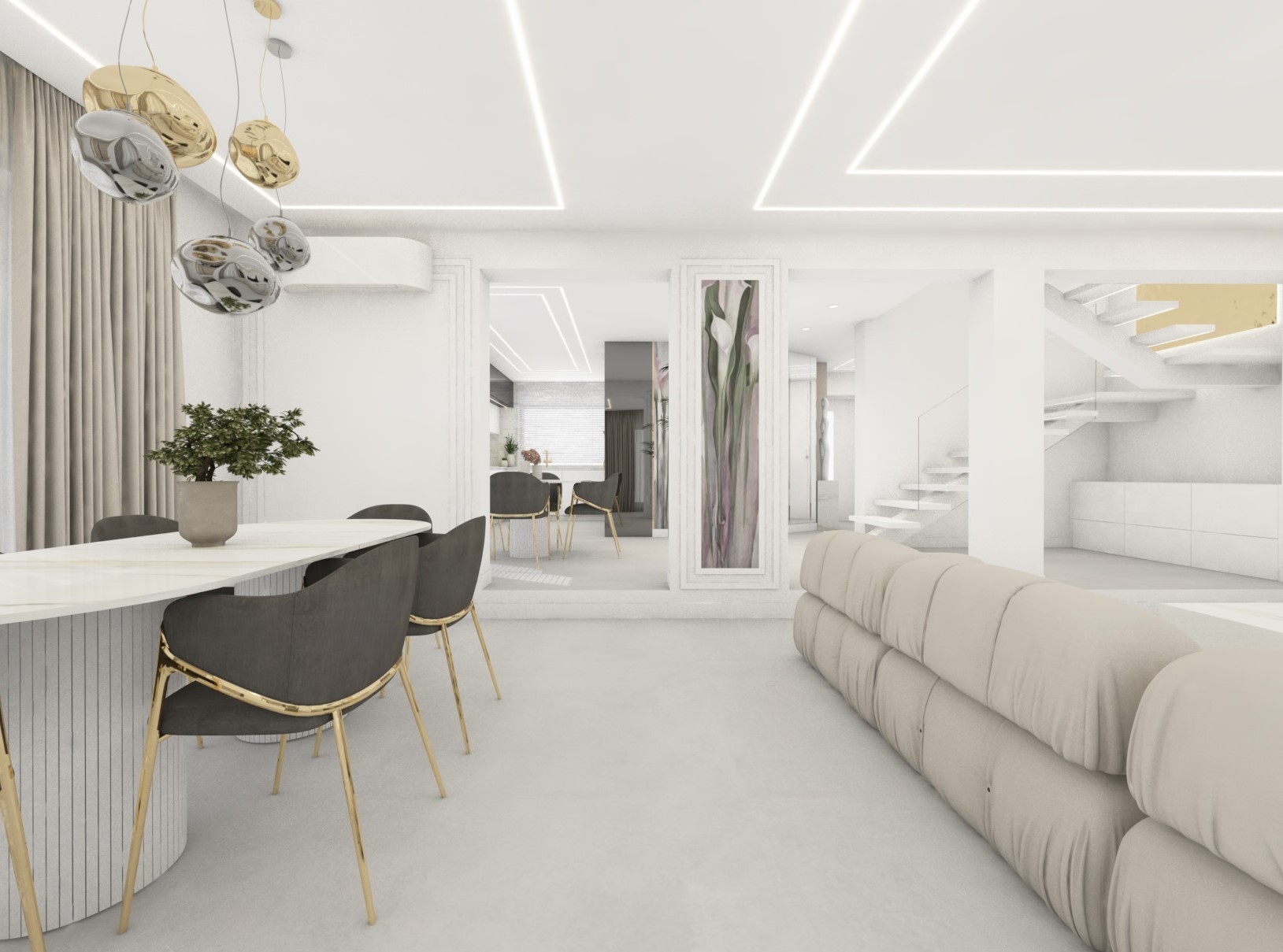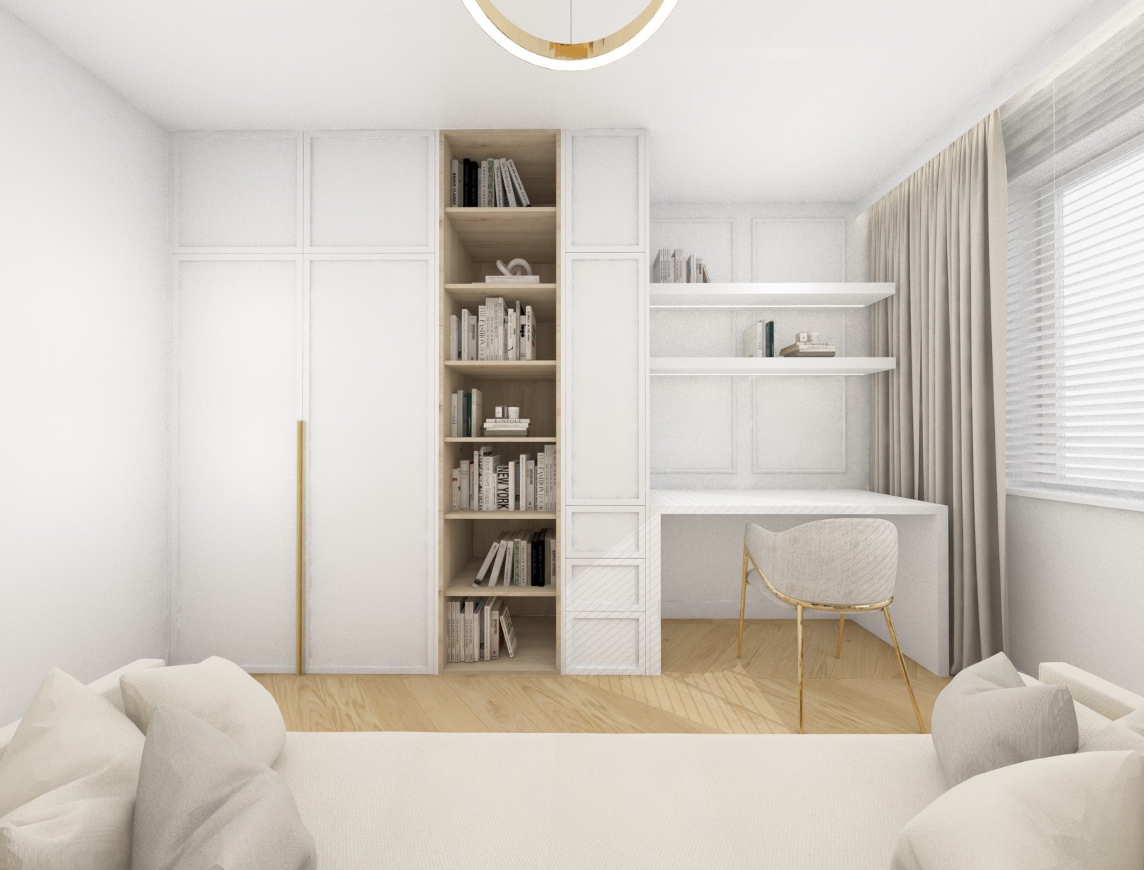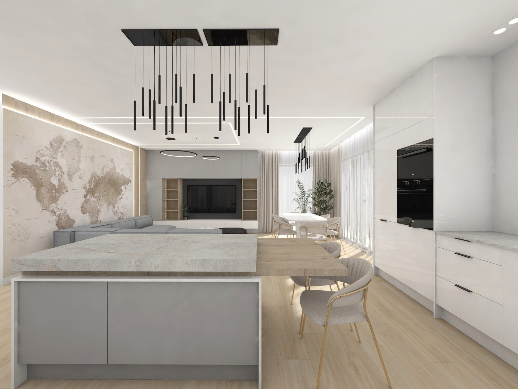 Projekt strefy dziennej w stonowanej kolorystyce ze złotymi dodatkami oraz ciemniejszym akcentem w strefie wejścia