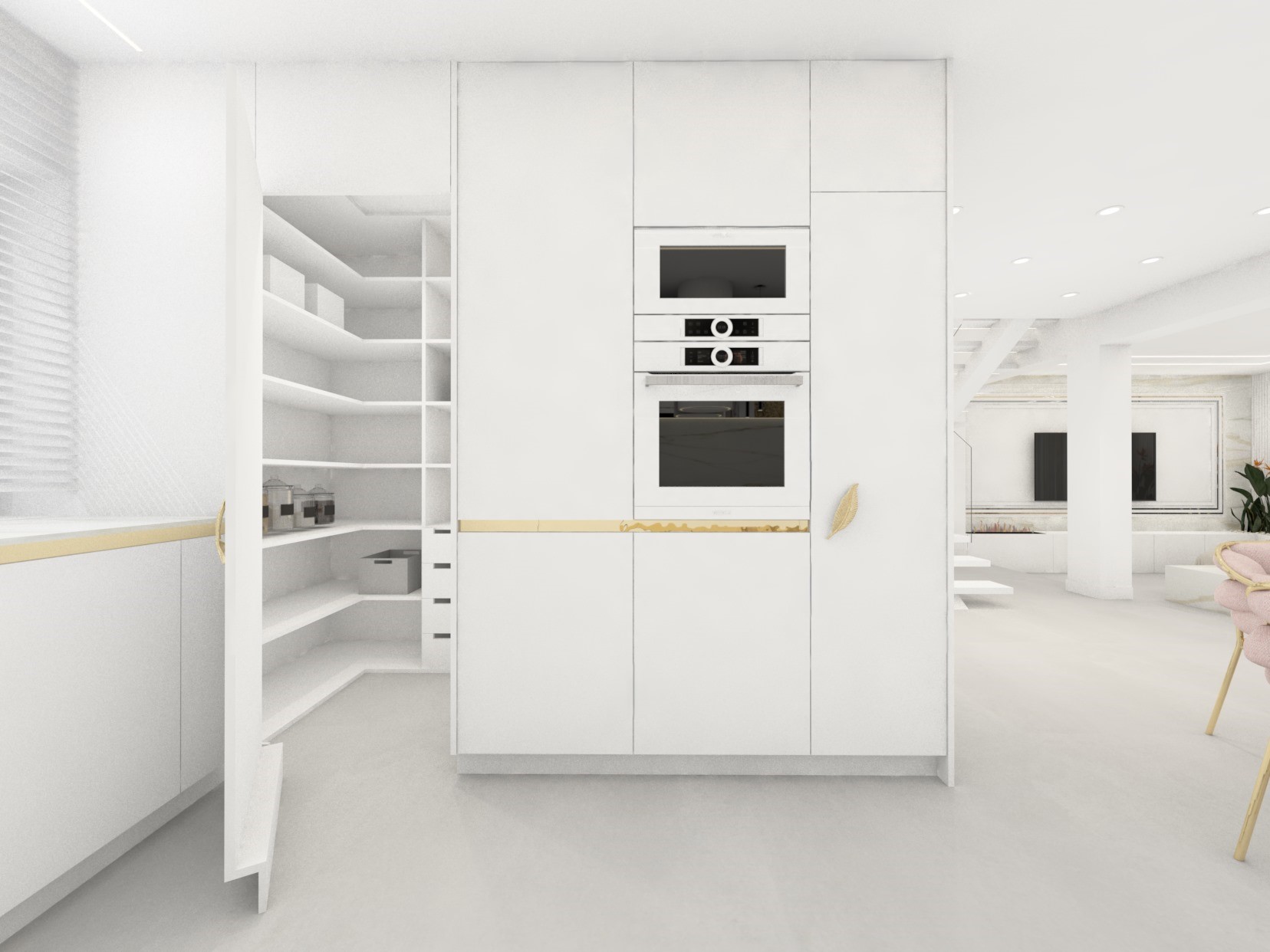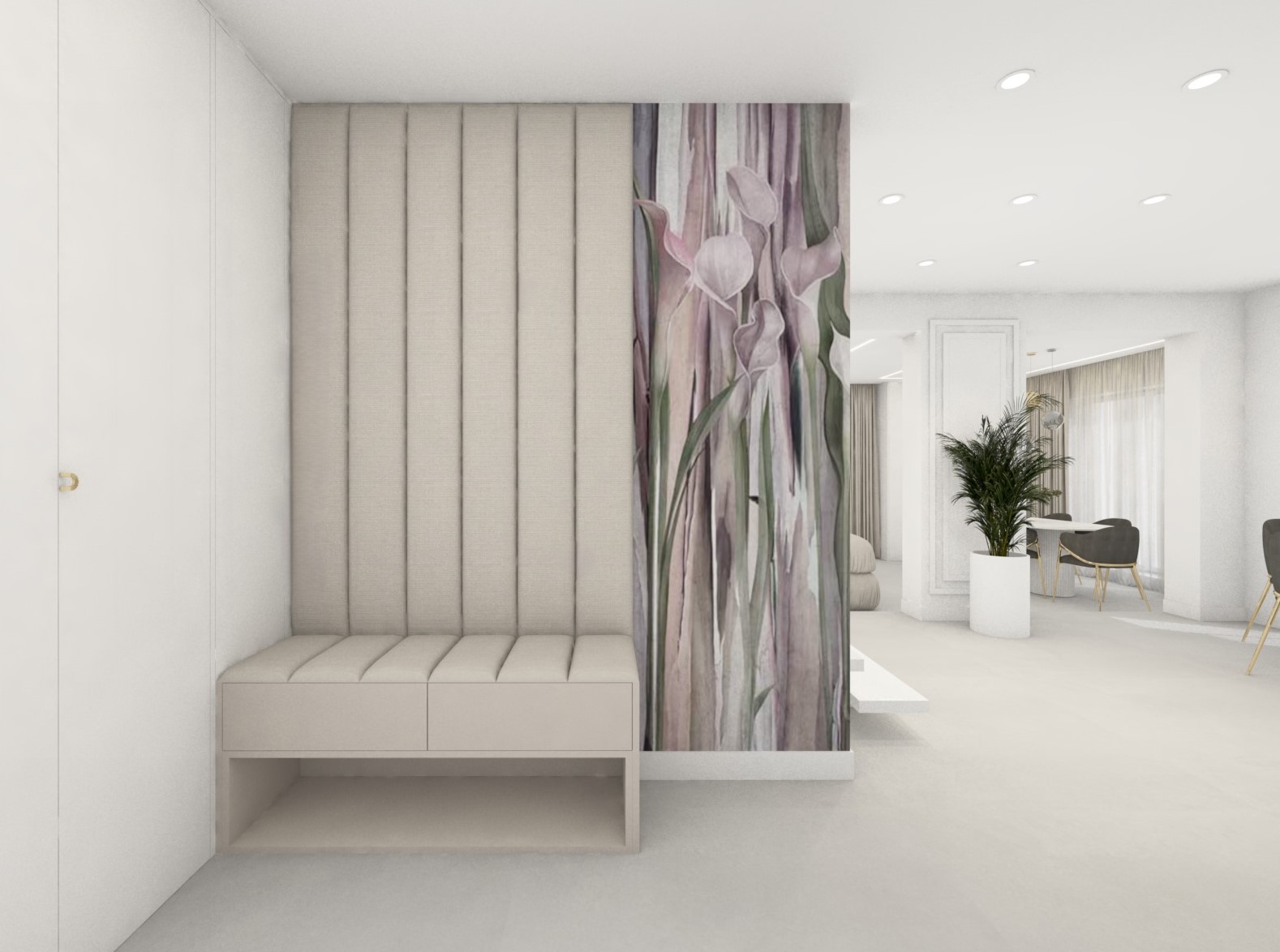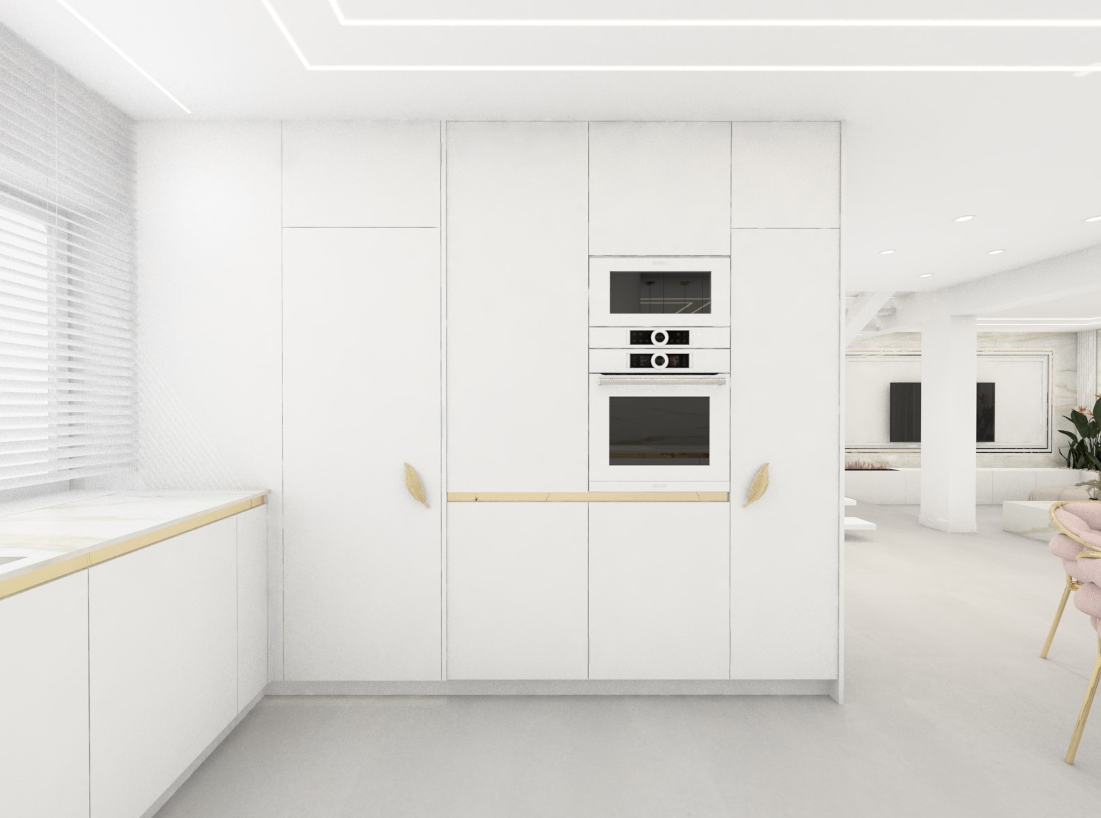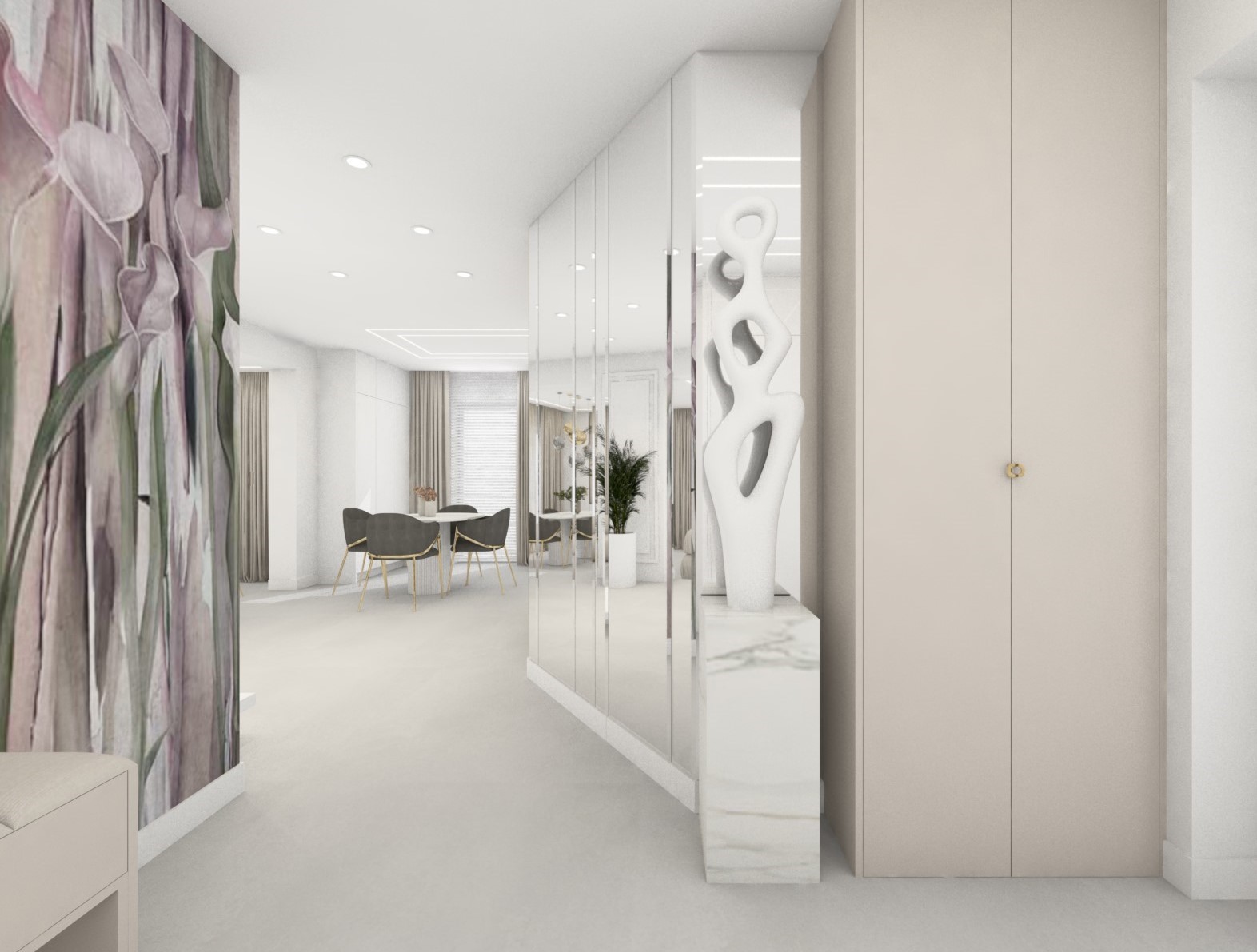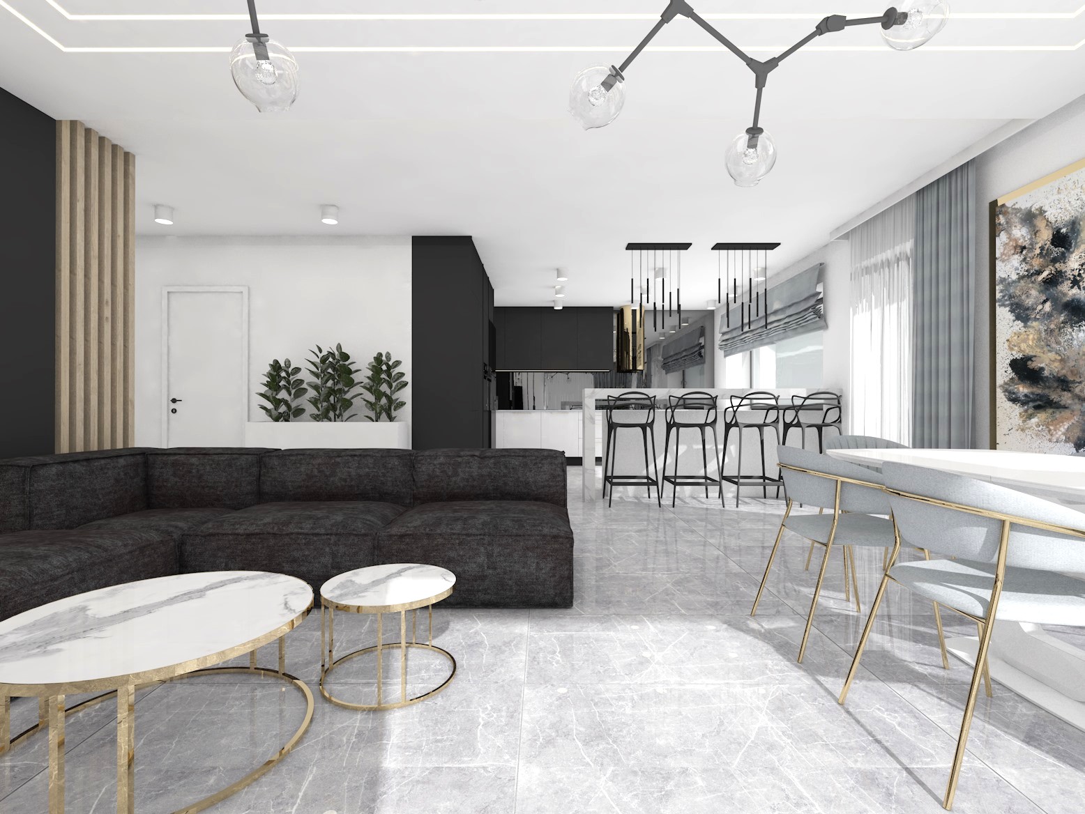 Projekt strefy dziennej w stonowanej kolorystyce ze złotymi dodatkami oraz ciemniejszym akcentem w strefie wejścia