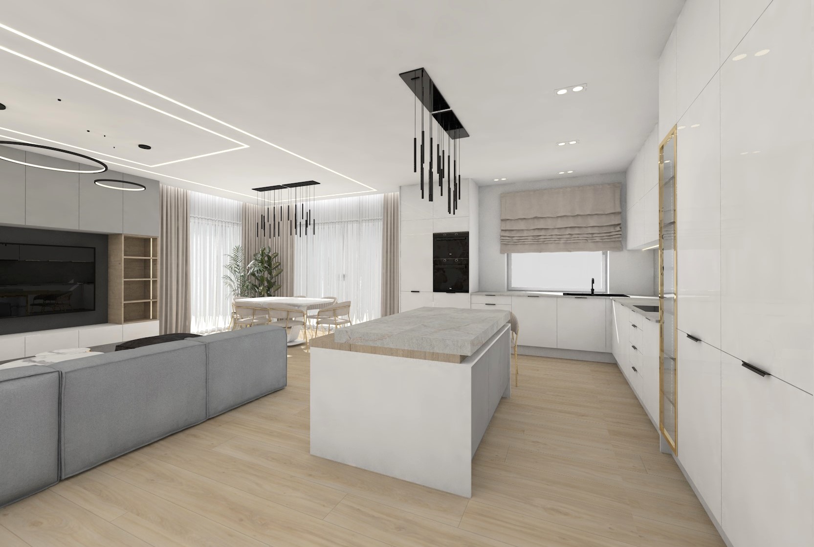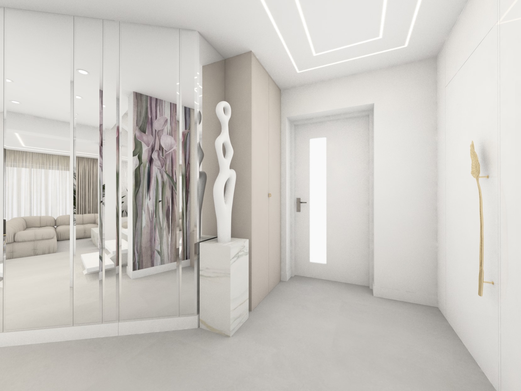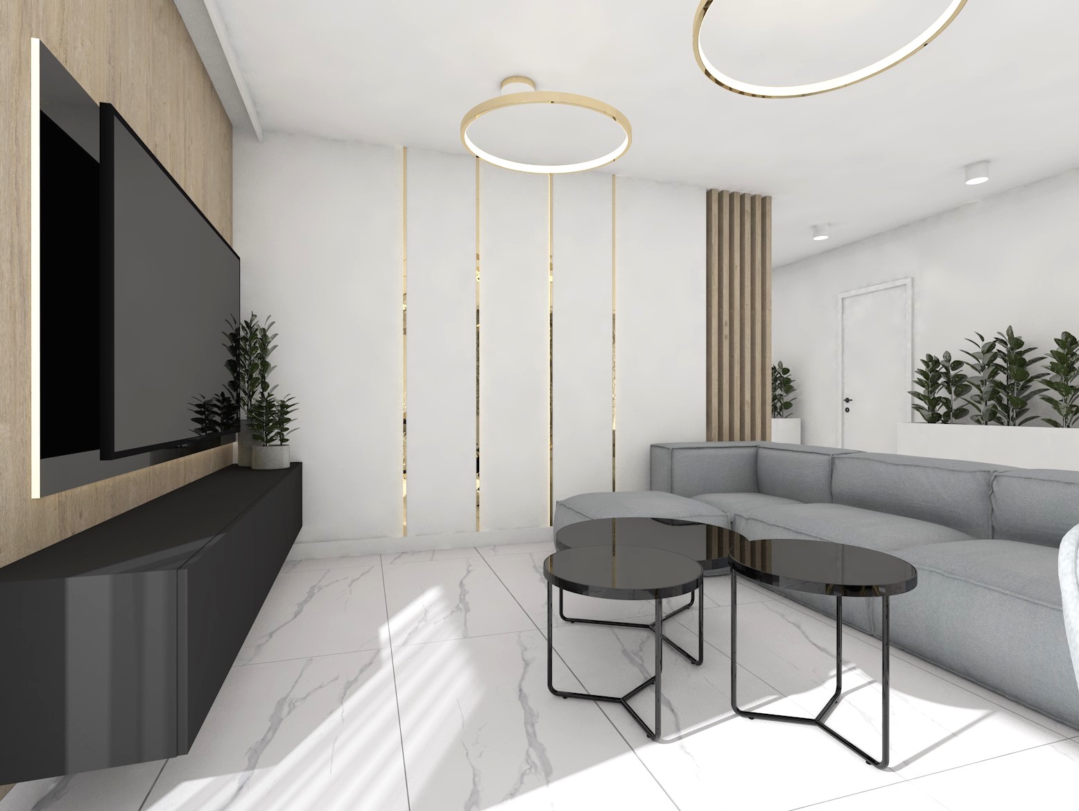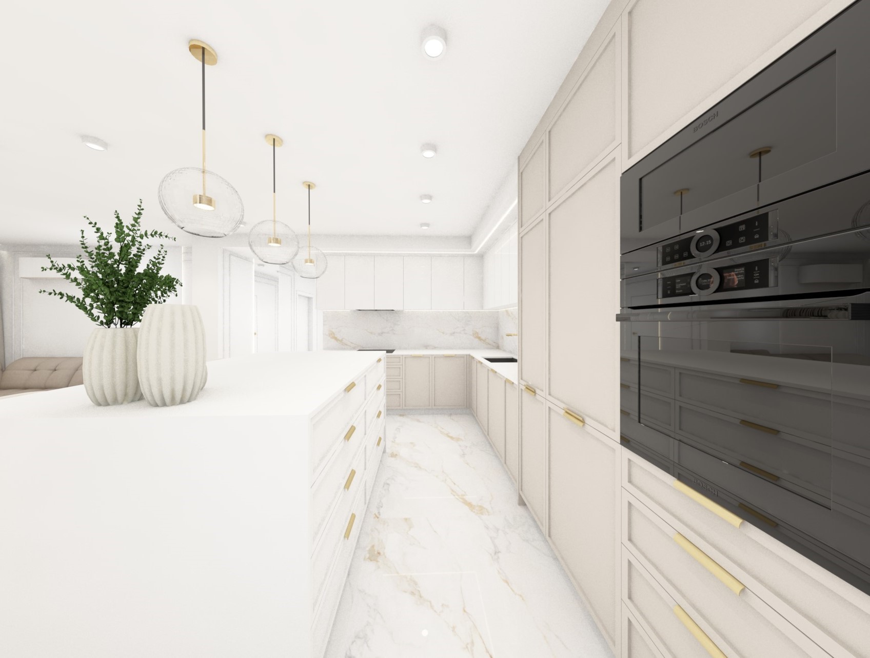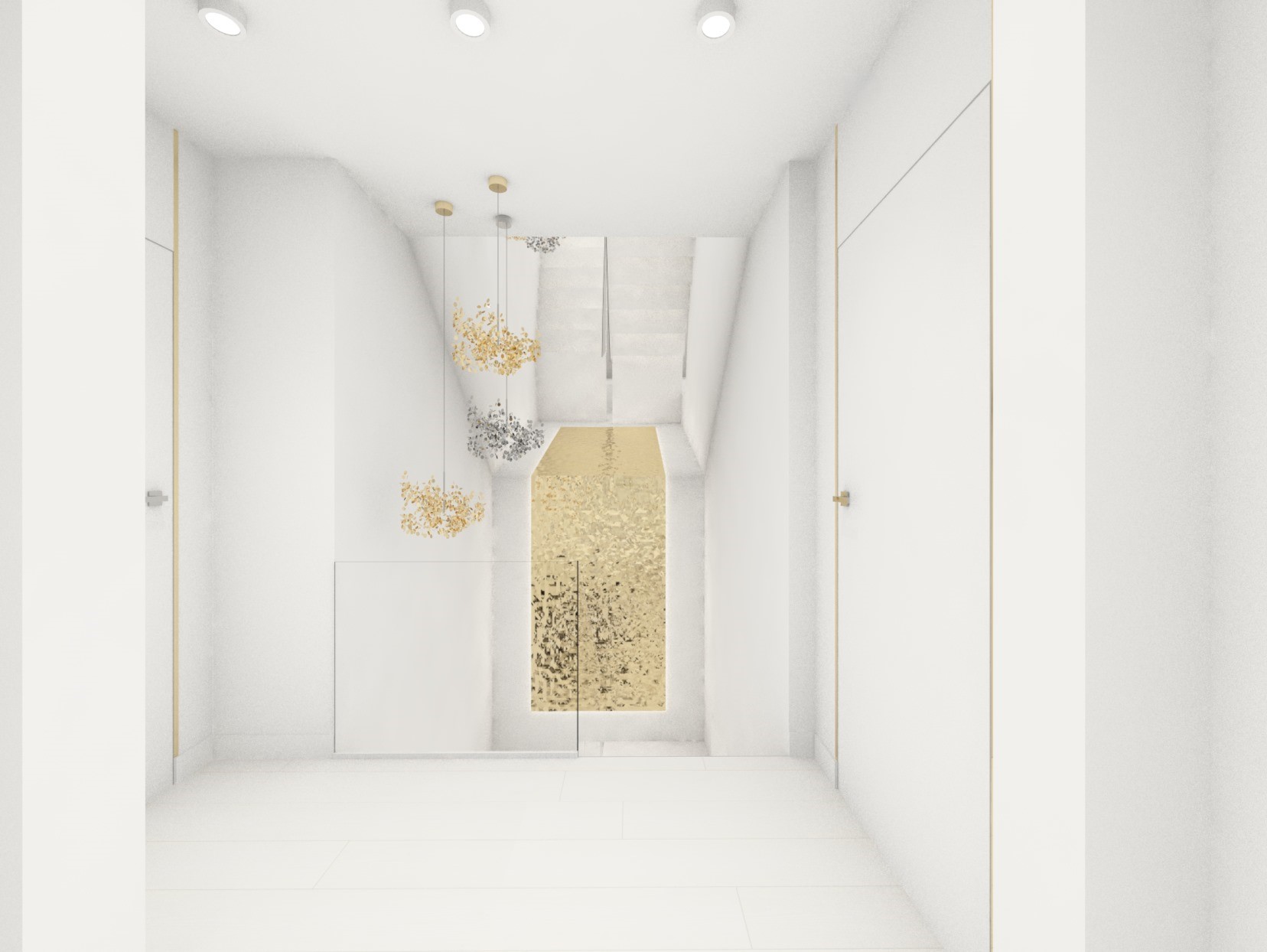 Projekt strefy dziennej w stonowanej kolorystyce ze złotymi dodatkami oraz ciemniejszym akcentem w strefie wejścia