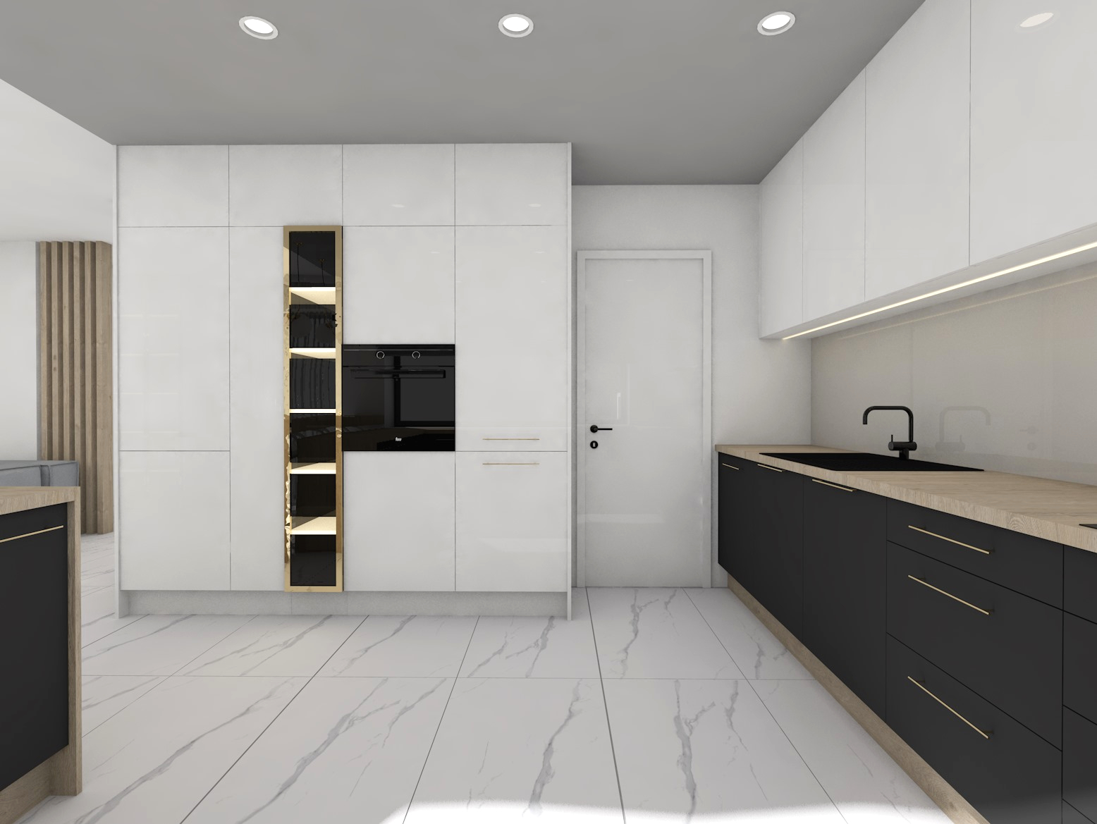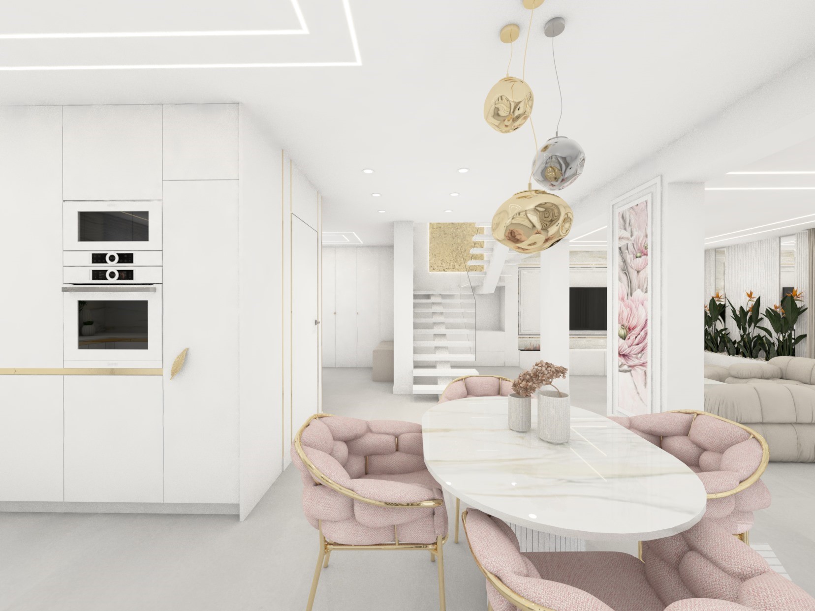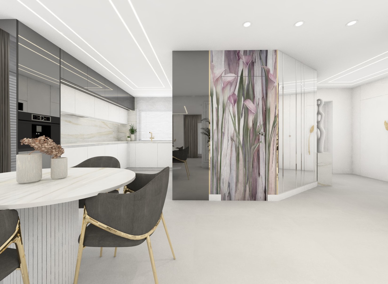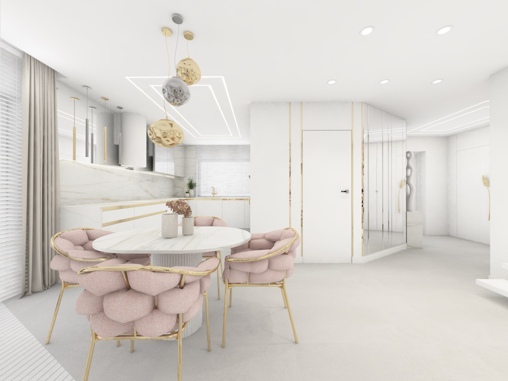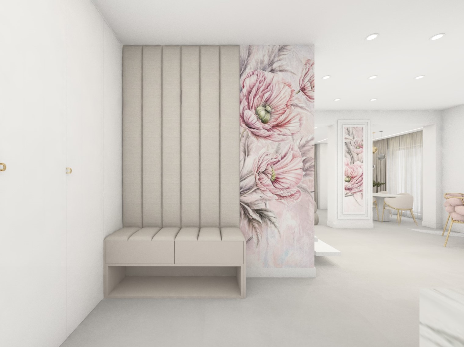 Projekt strefy dziennej w stonowanej kolorystyce ze złotymi dodatkami oraz ciemniejszym akcentem w strefie wejścia