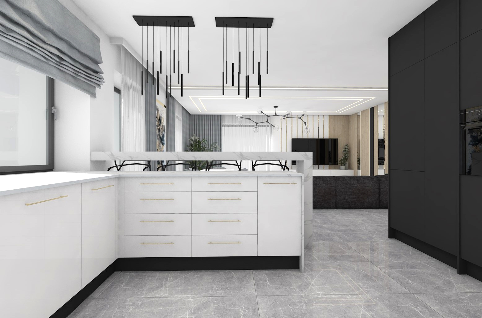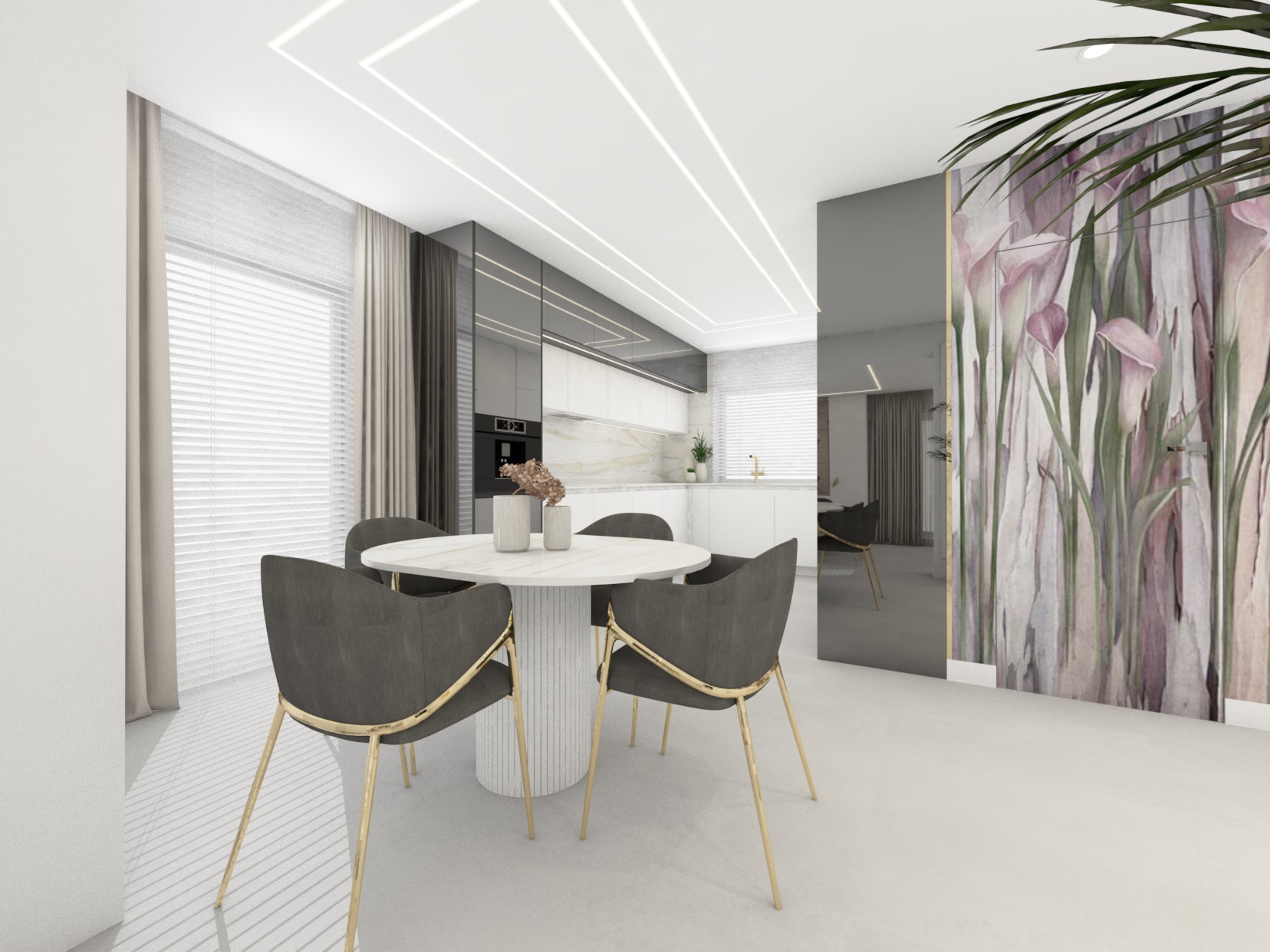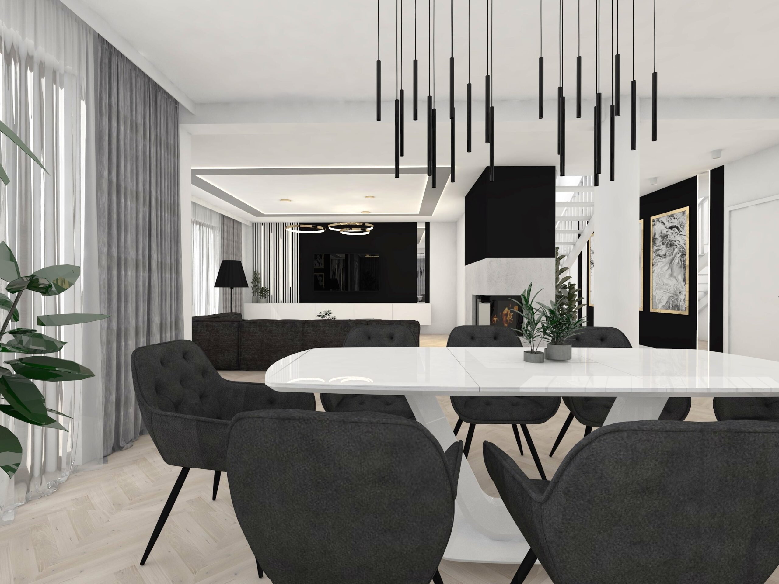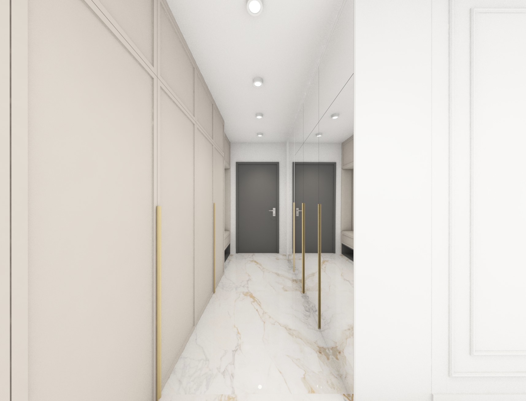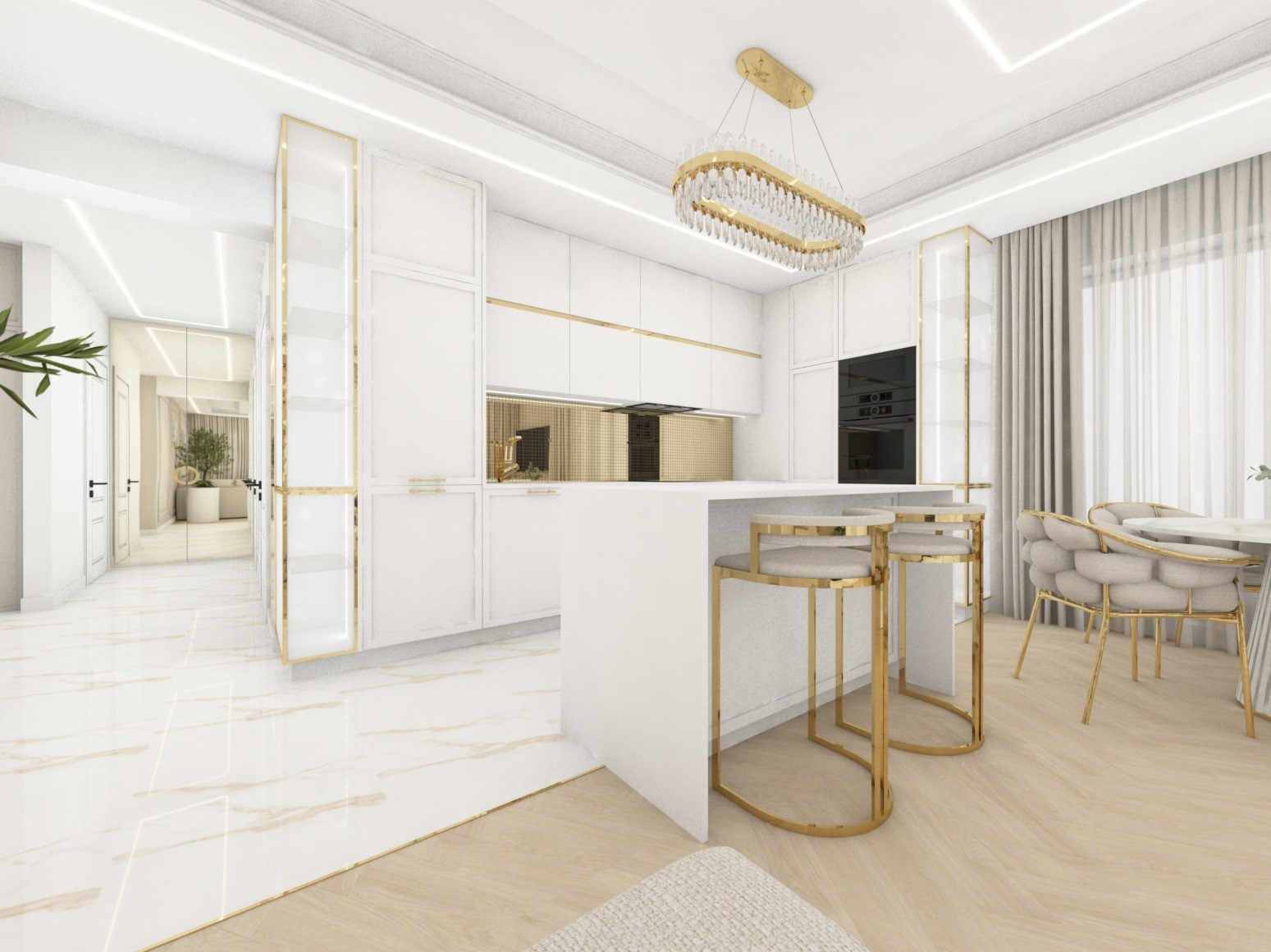 Projekt strefy dziennej w stonowanej kolorystyce ze złotymi dodatkami oraz ciemniejszym akcentem w strefie wejścia