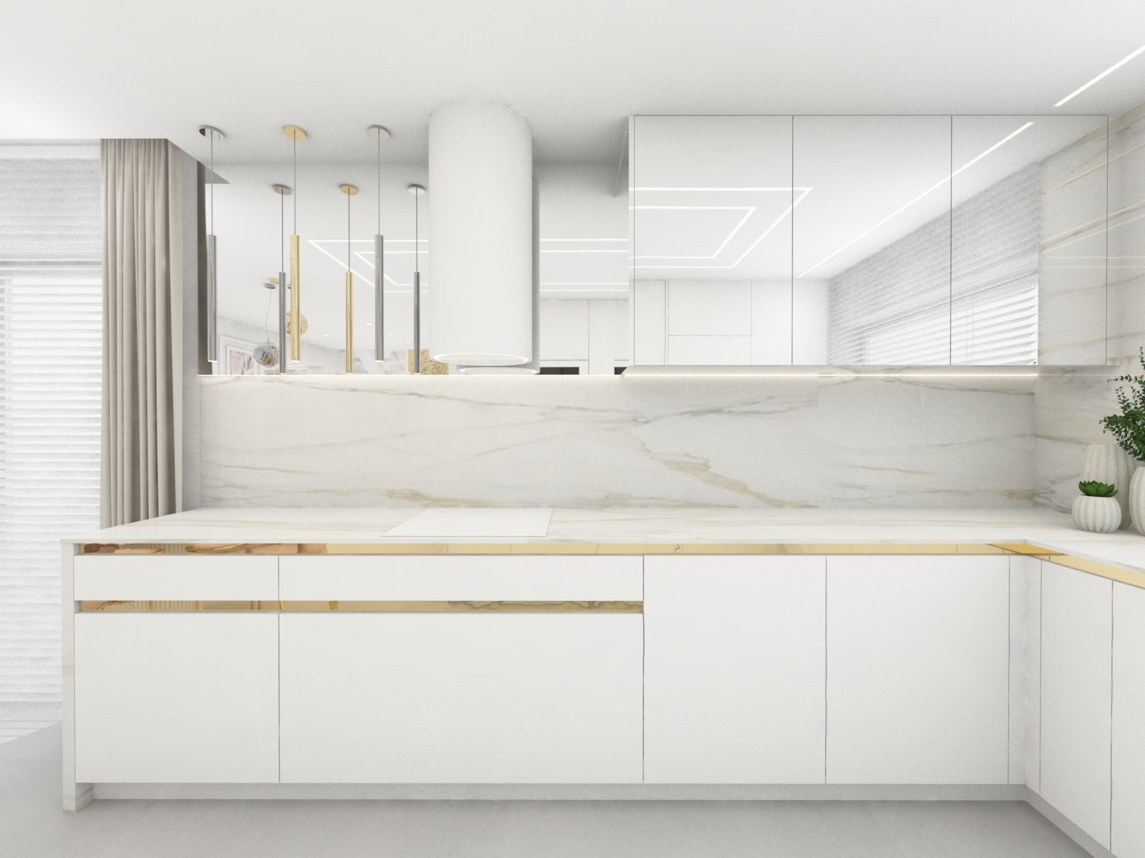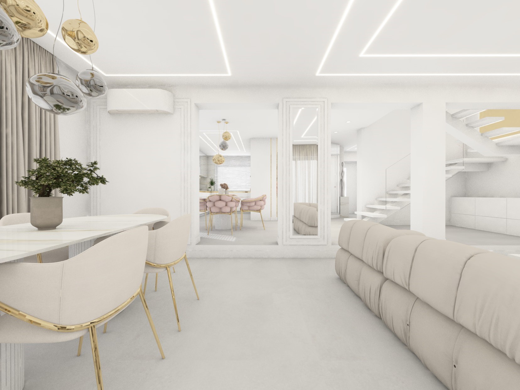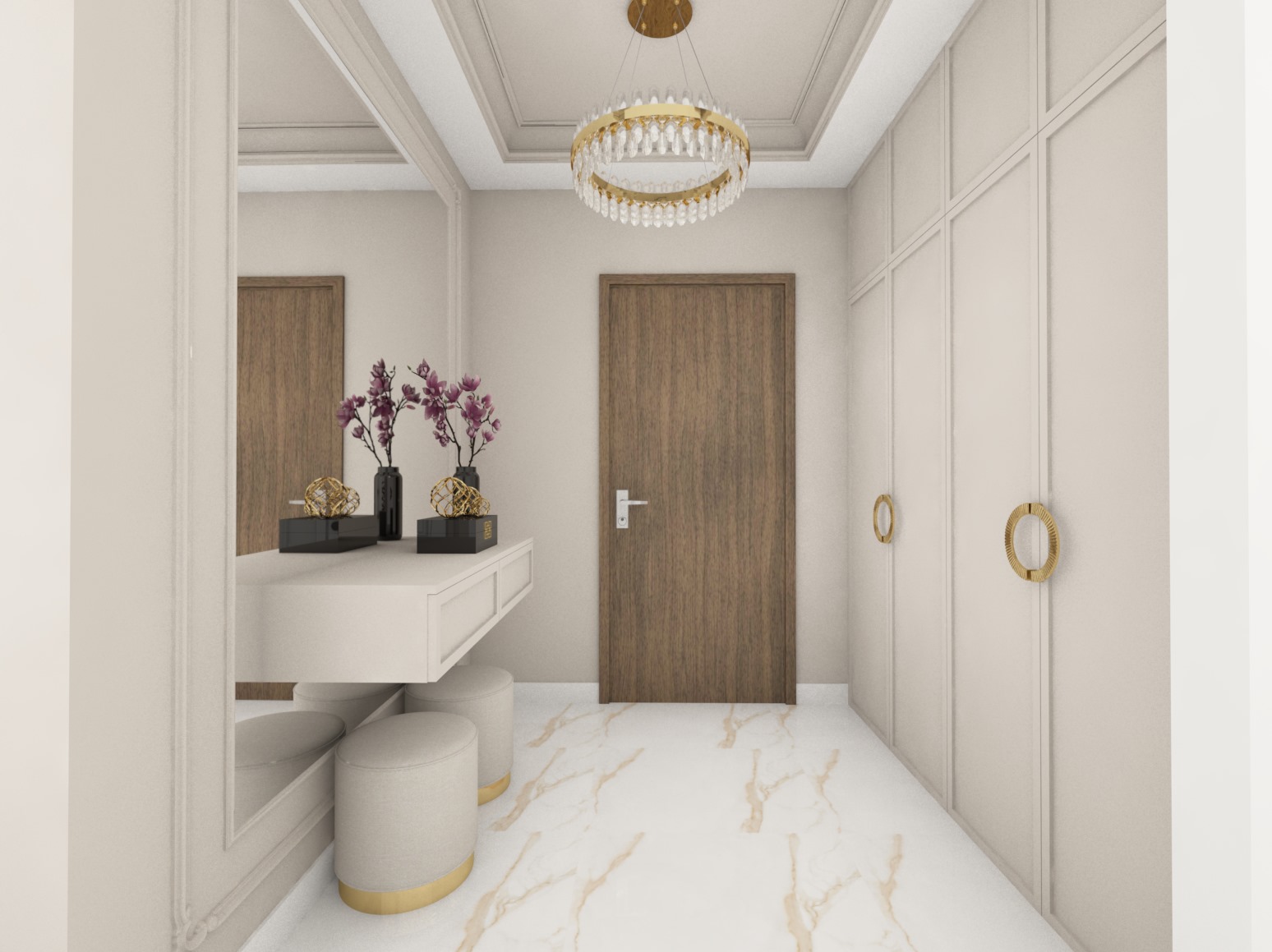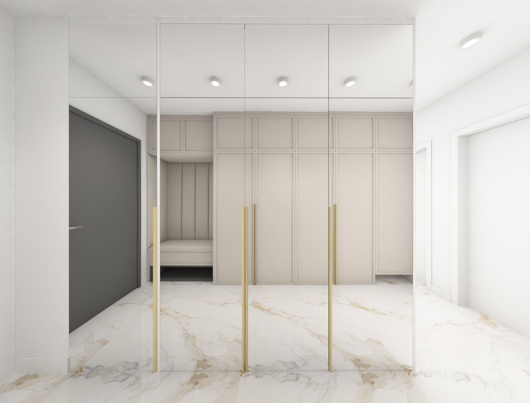 Projekt strefy dziennej w stonowanej kolorystyce ze złotymi dodatkami oraz ciemniejszym akcentem w strefie wejścia