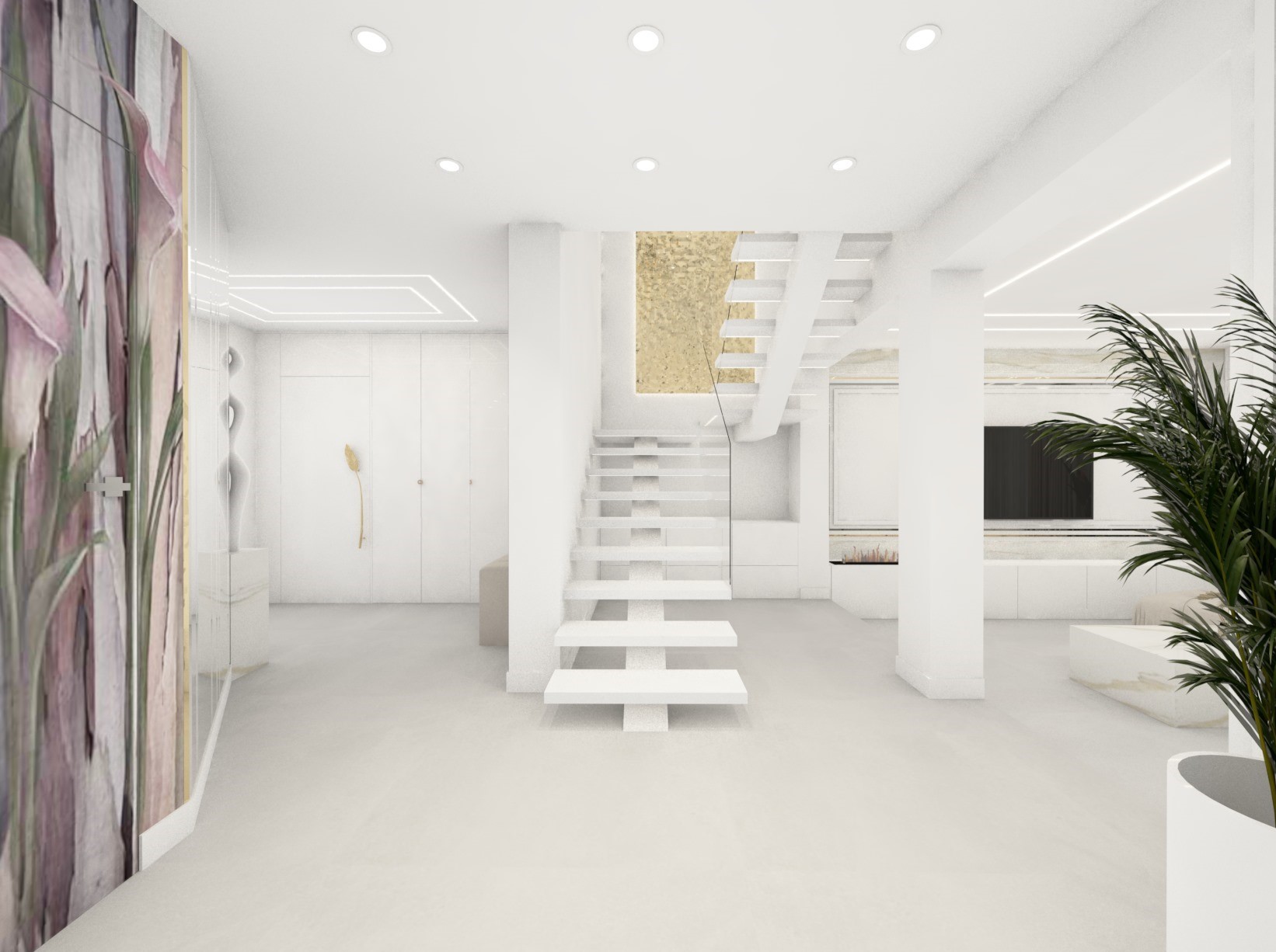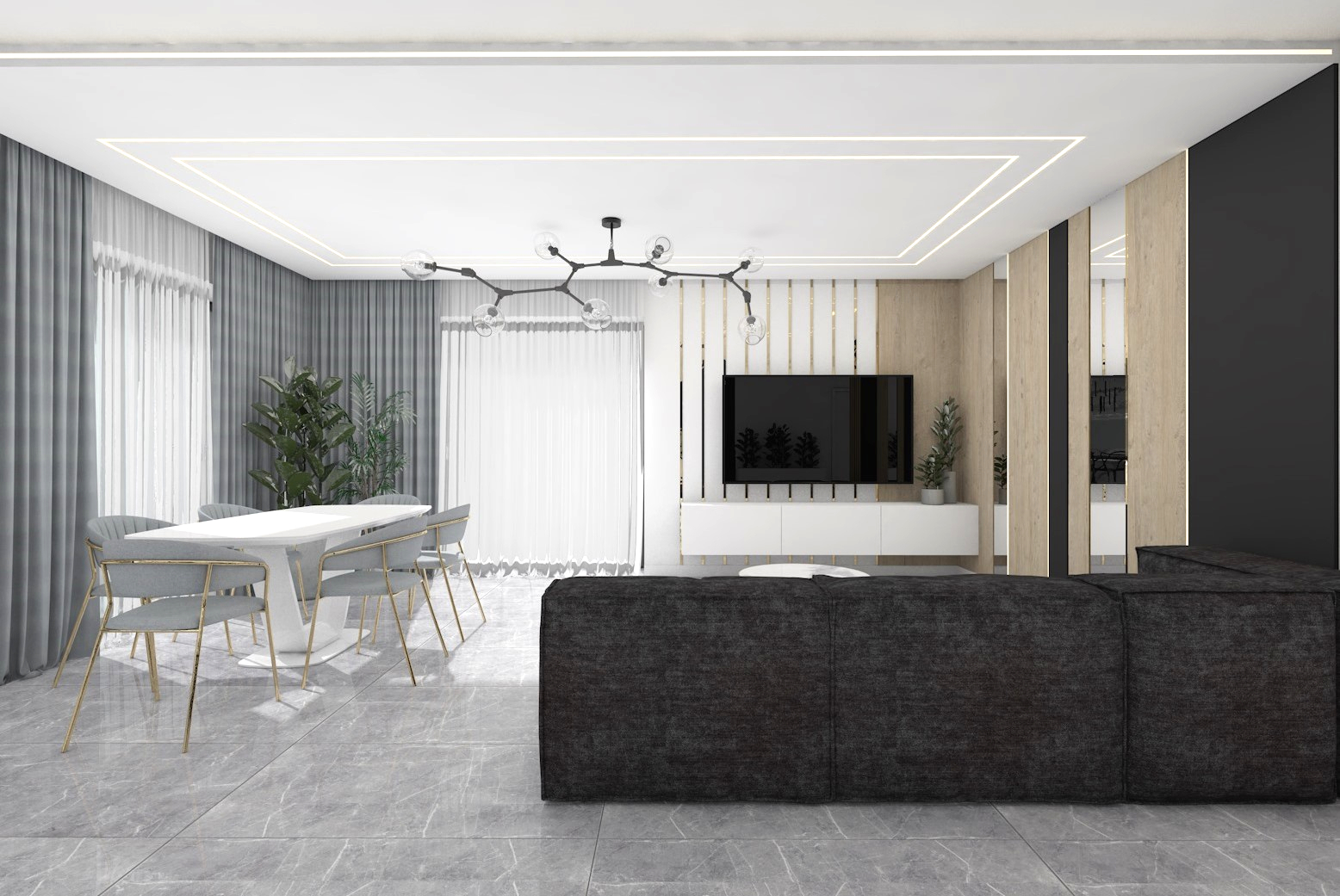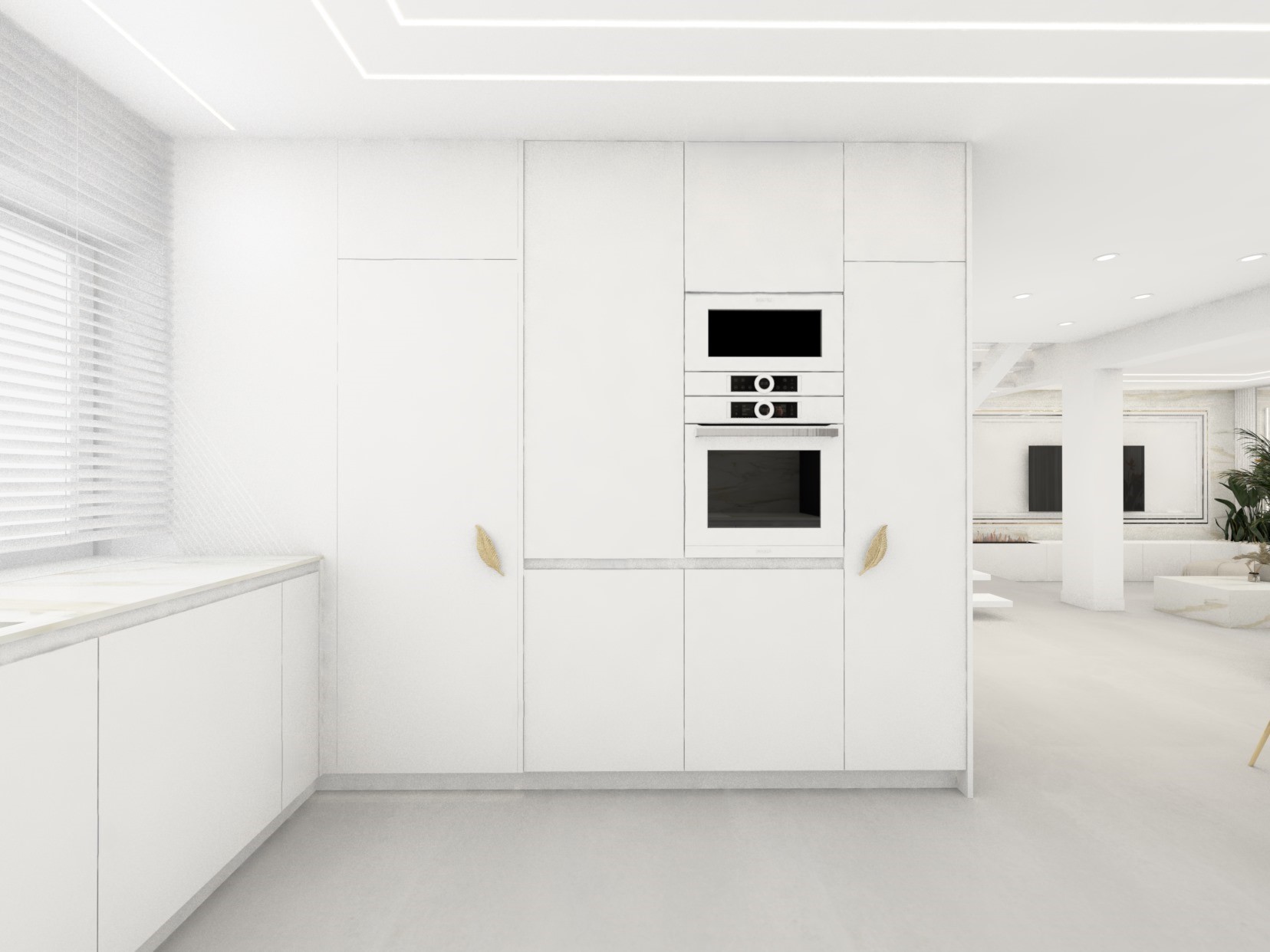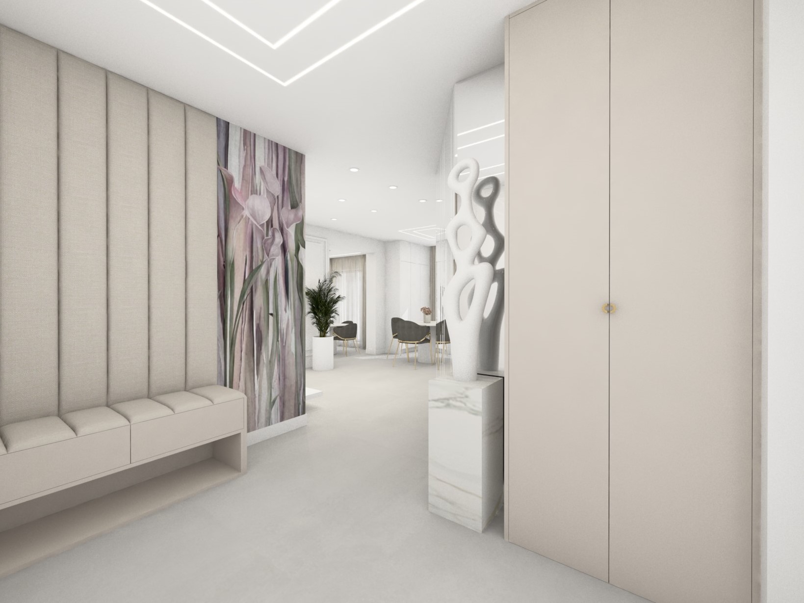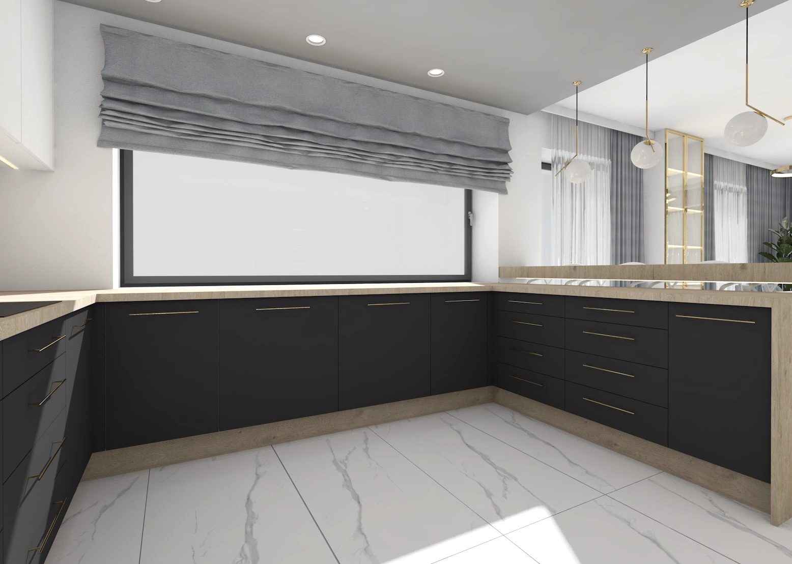 Projekt strefy dziennej w stonowanej kolorystyce ze złotymi dodatkami oraz ciemniejszym akcentem w strefie wejścia
