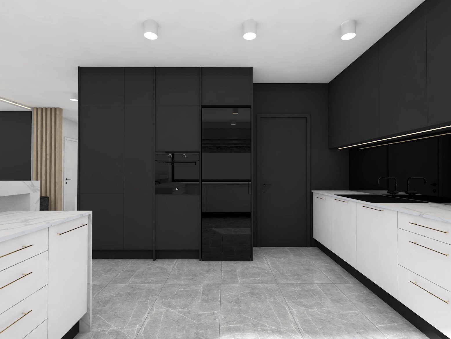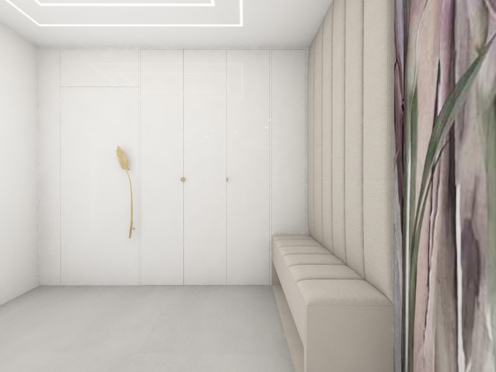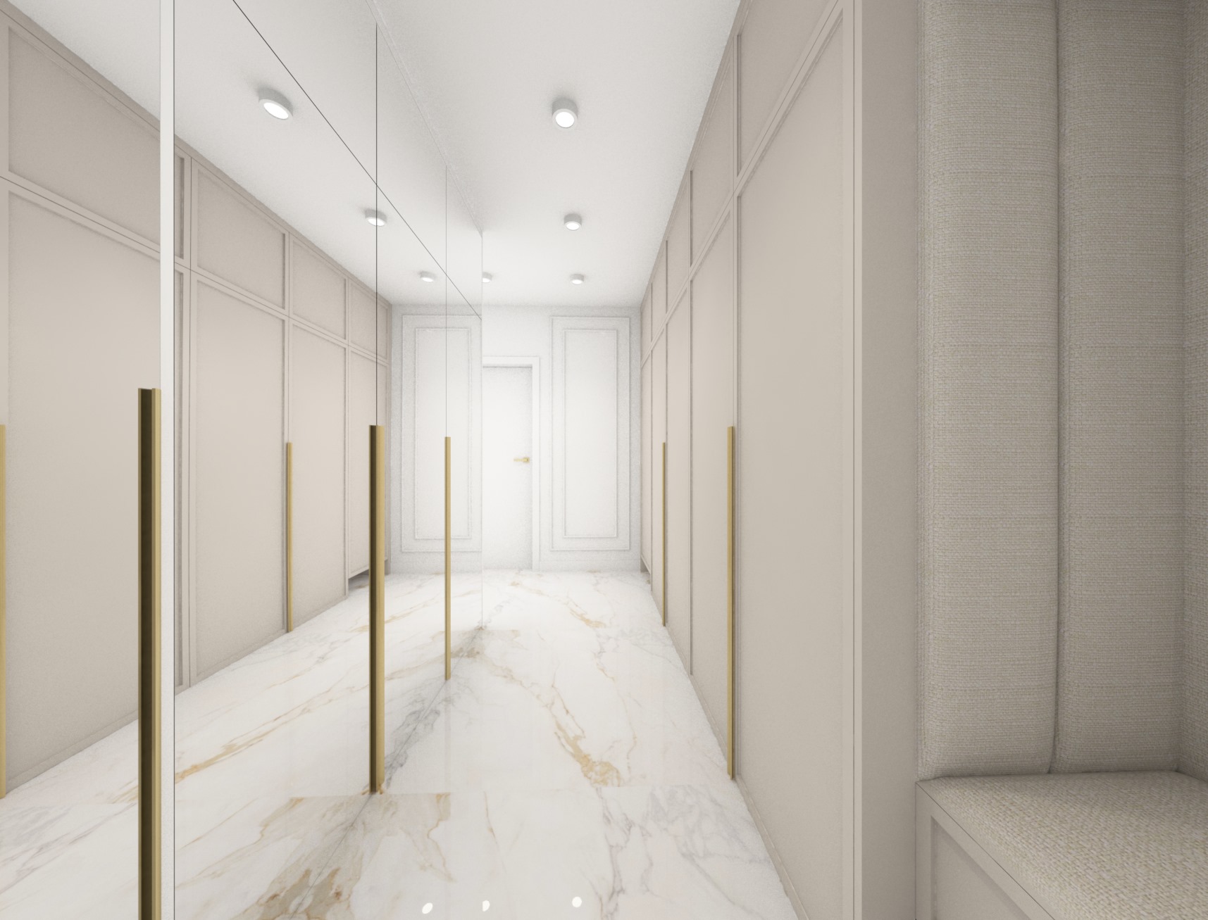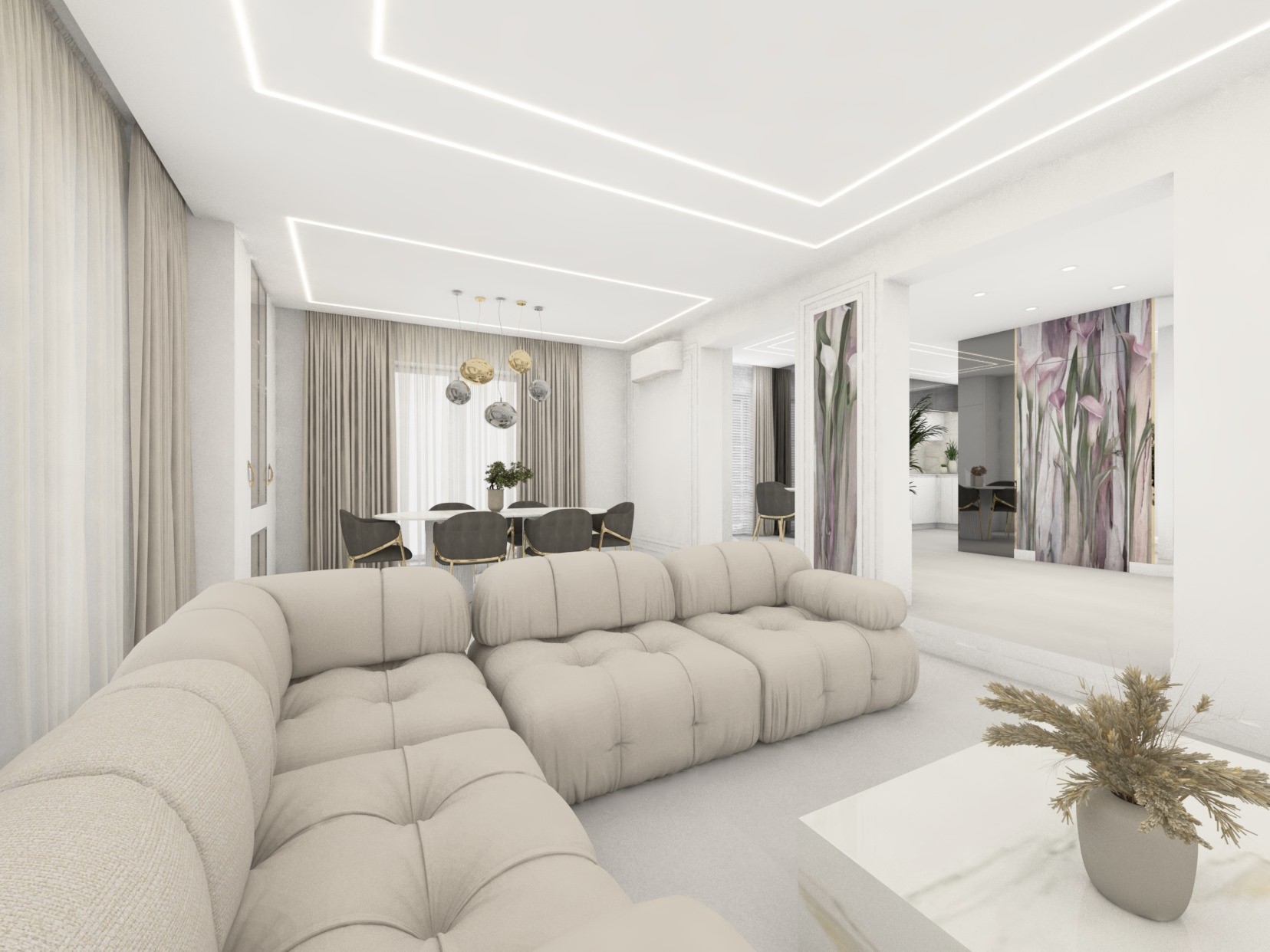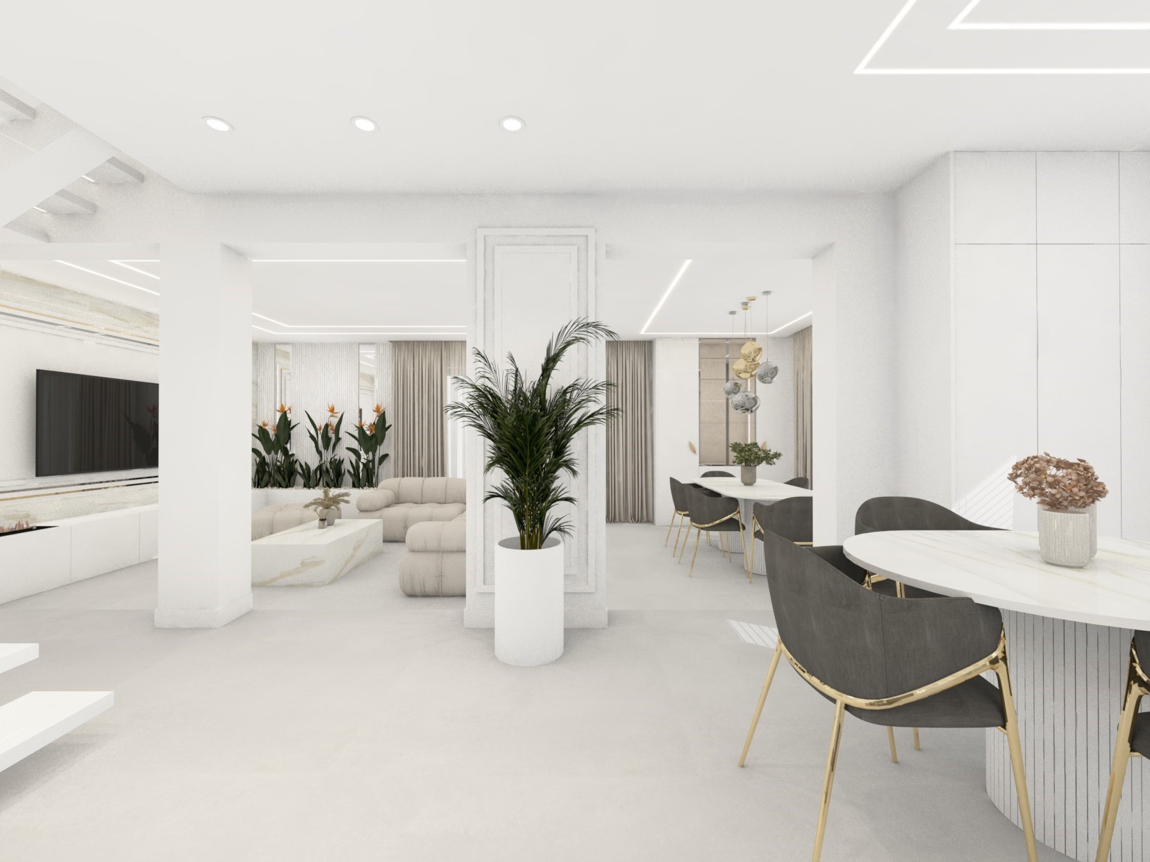 Projekt strefy dziennej w stonowanej kolorystyce ze złotymi dodatkami oraz ciemniejszym akcentem w strefie wejścia