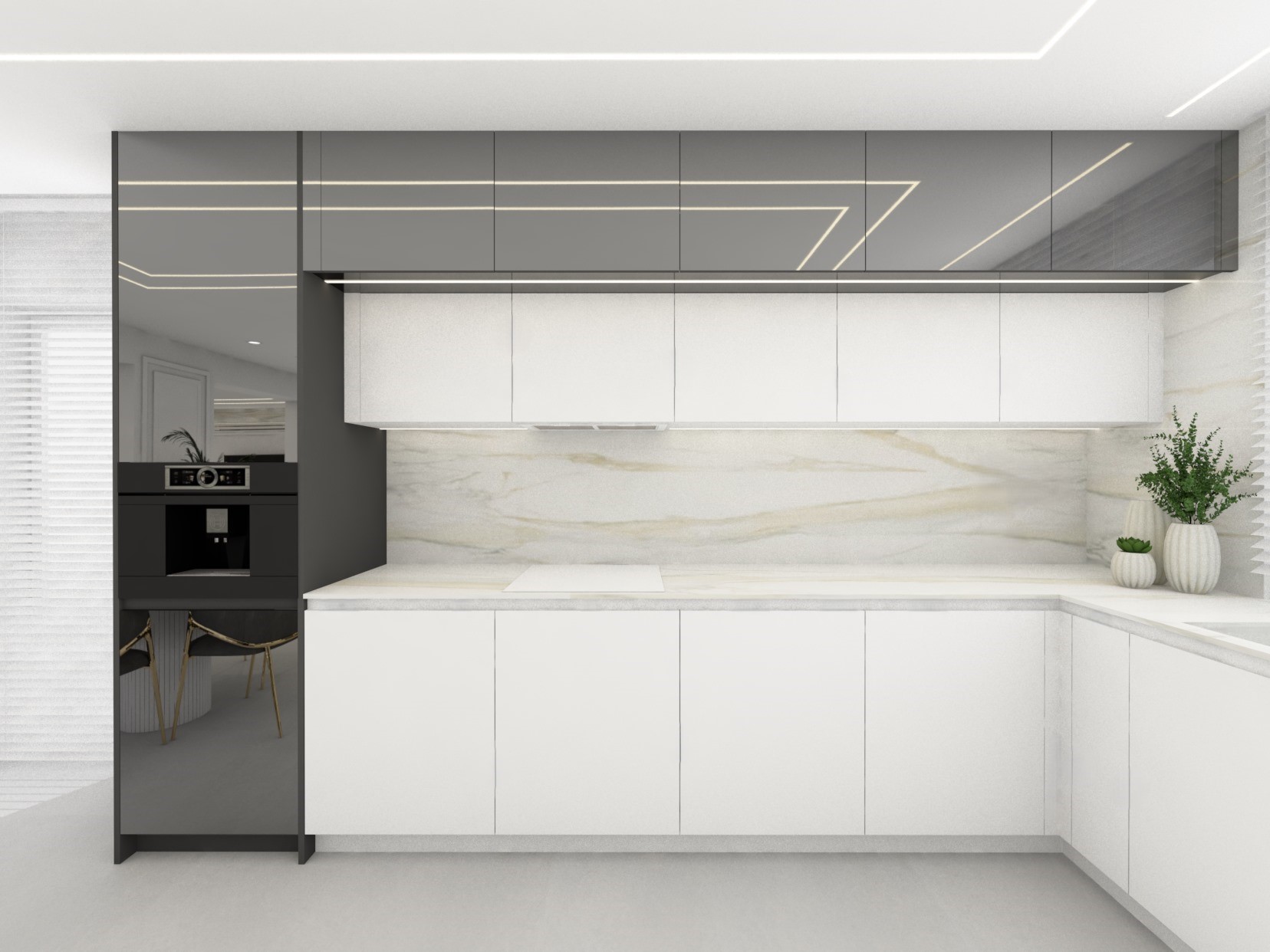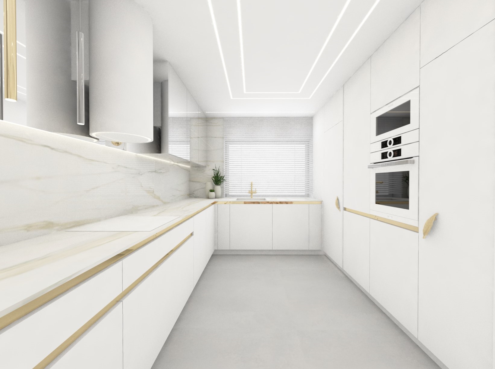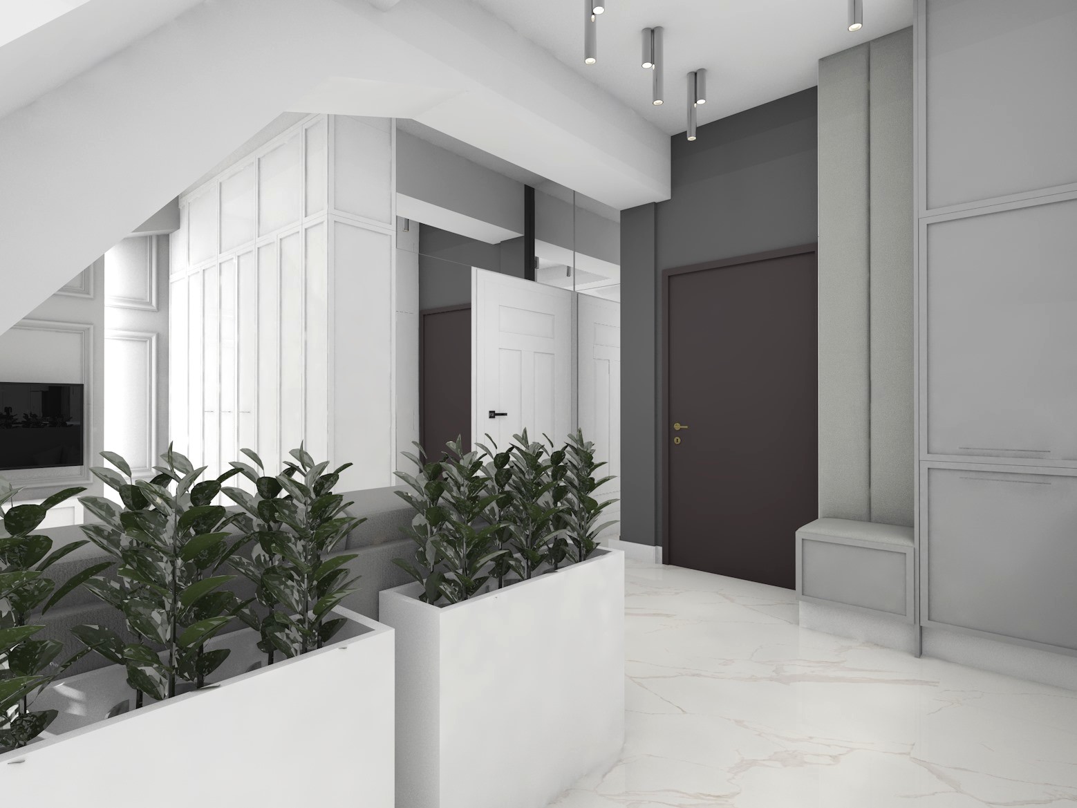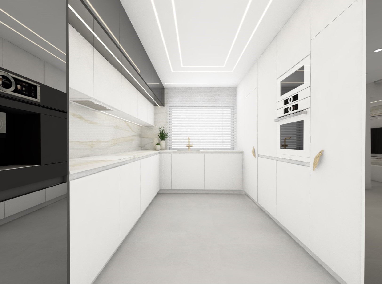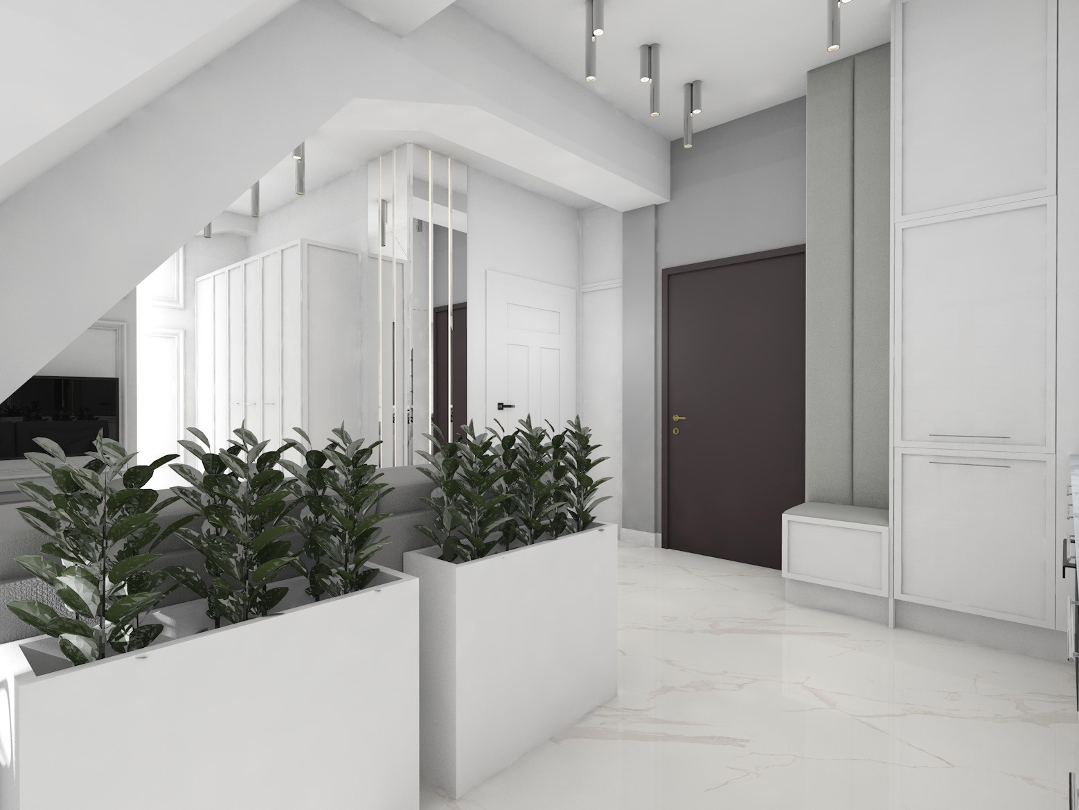 Projekt strefy dziennej w stonowanej kolorystyce ze złotymi dodatkami oraz ciemniejszym akcentem w strefie wejścia