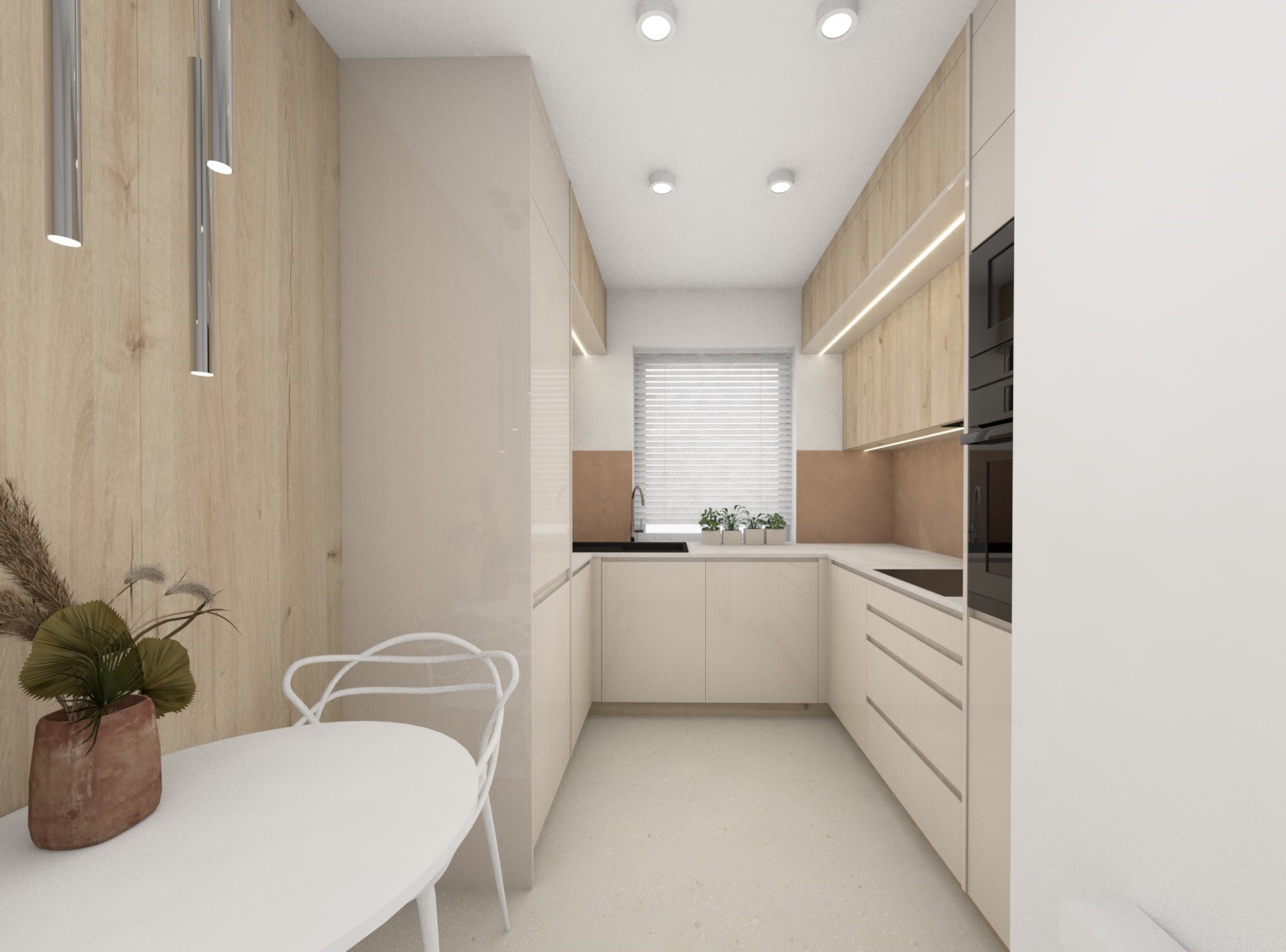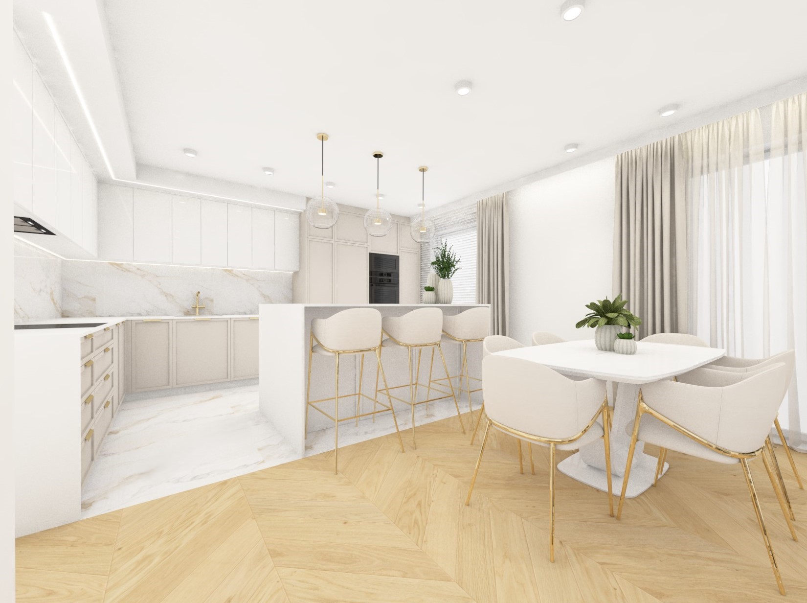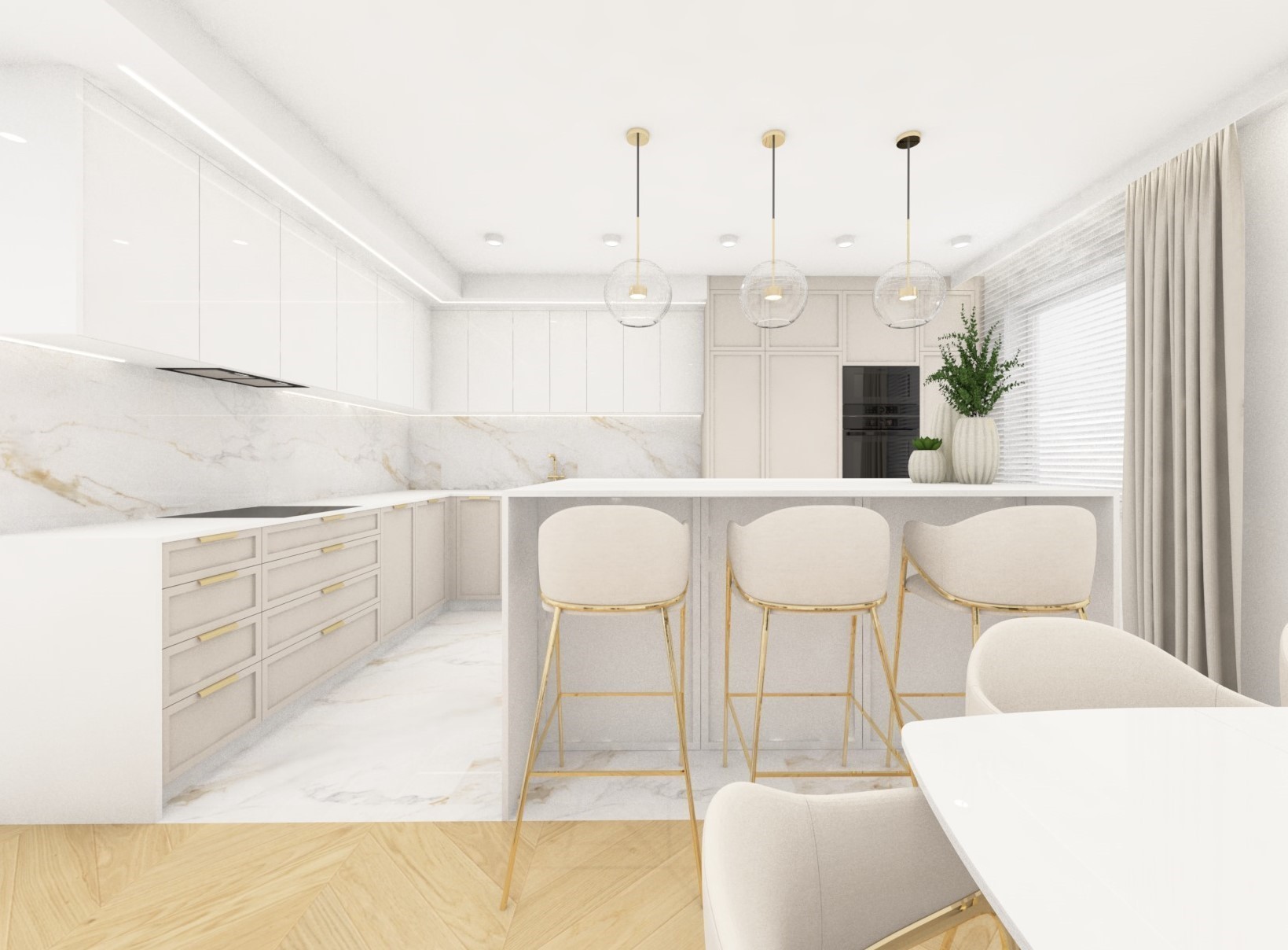Projekt kuchni połączonej z jadalnią w przytulnych beżach
