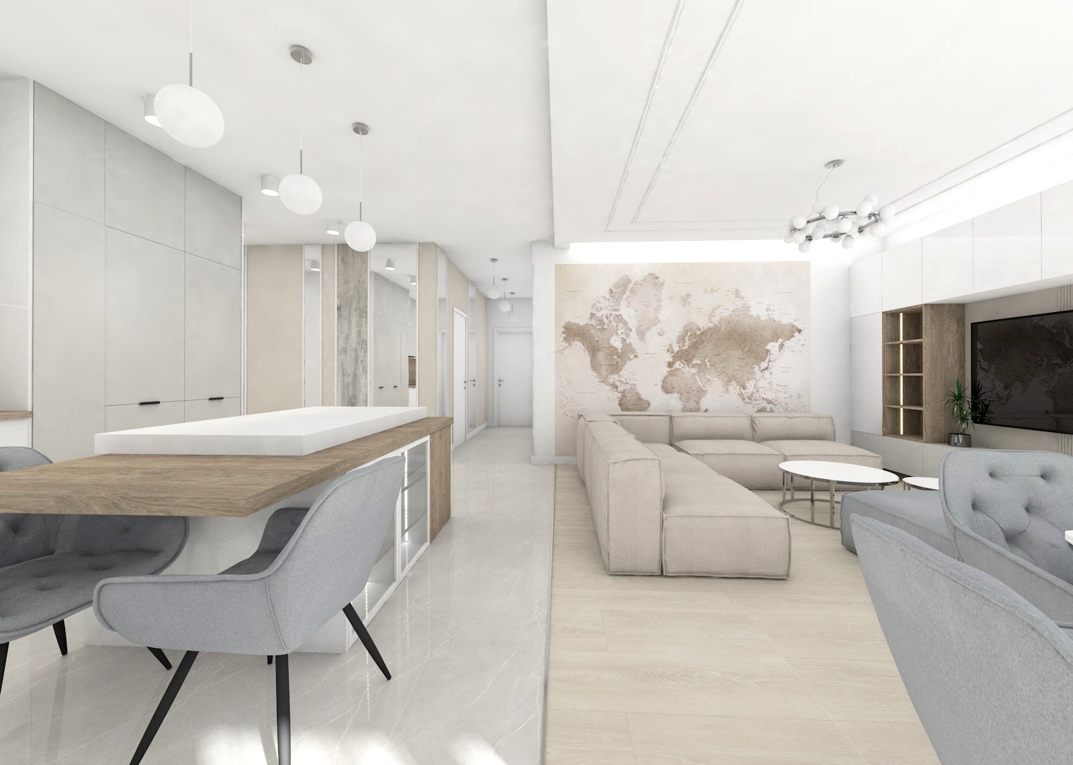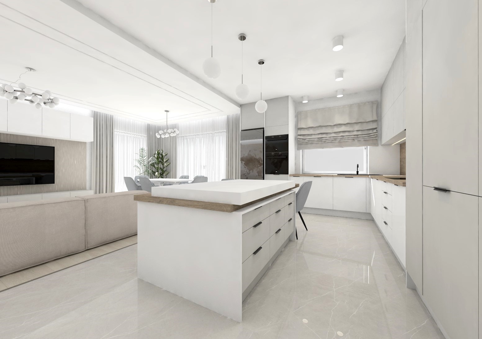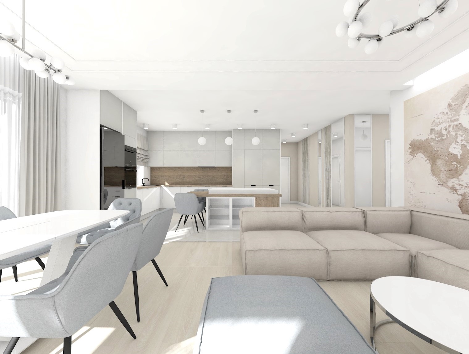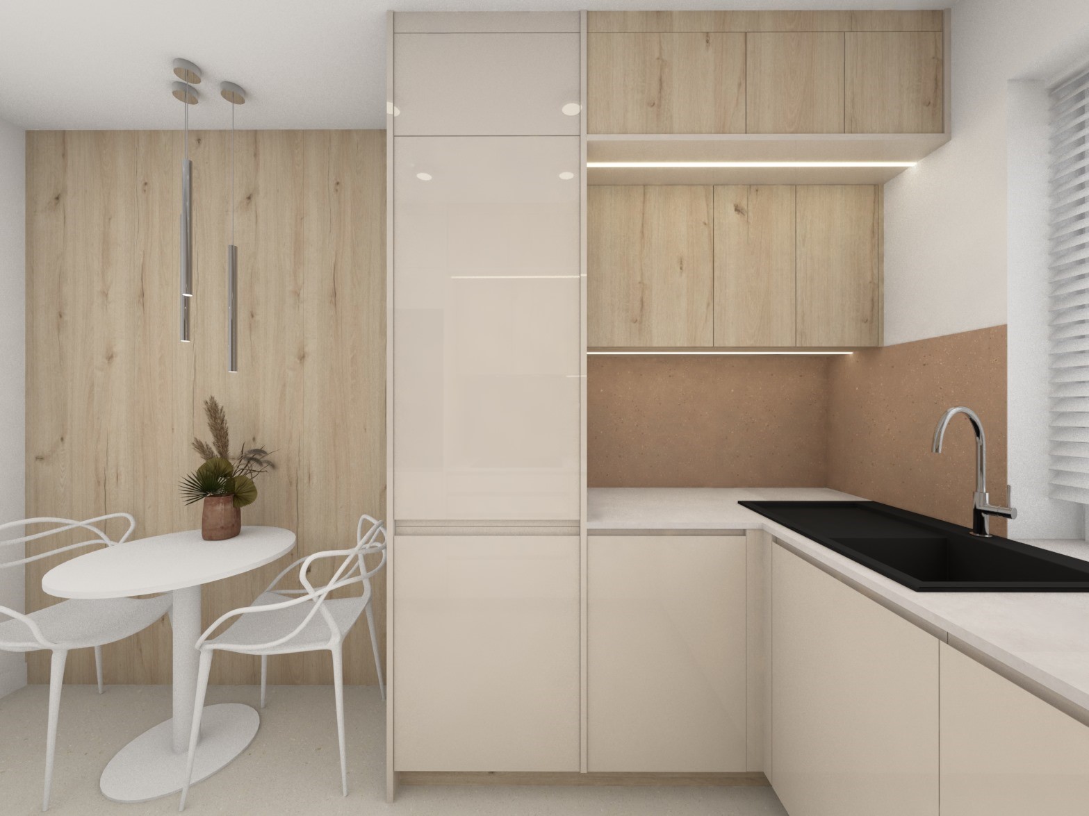Projekt kuchni połączonej z jadalnią w przytulnych beżach