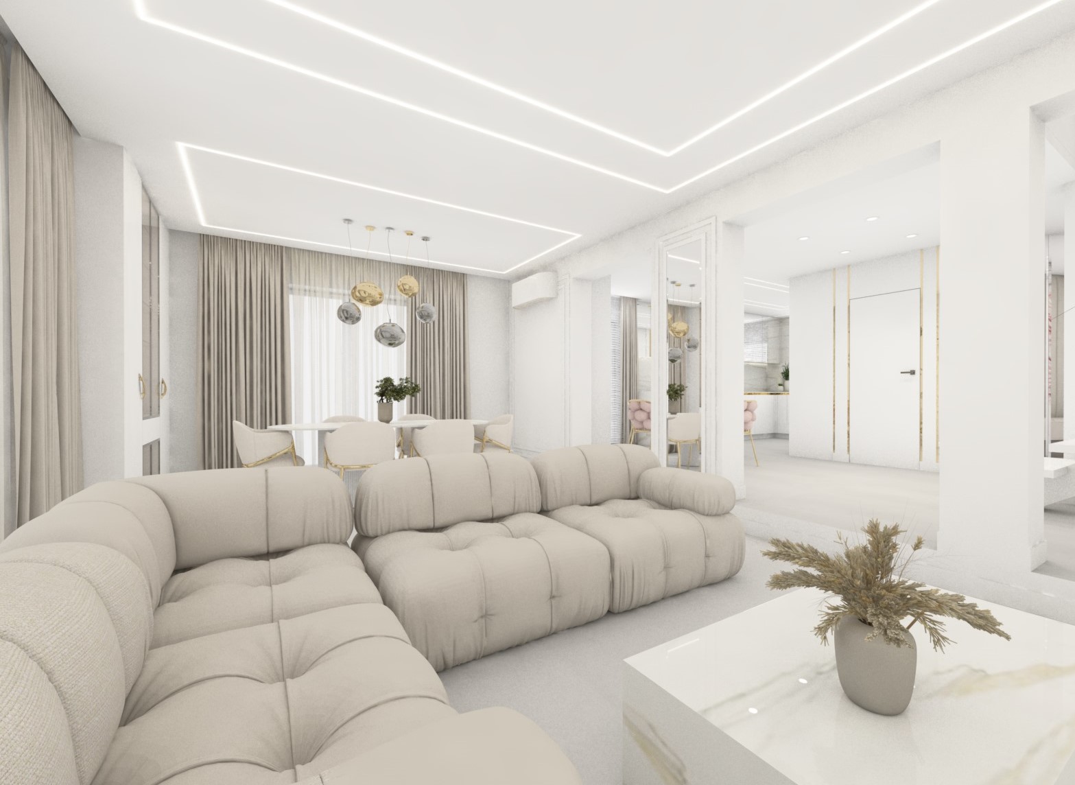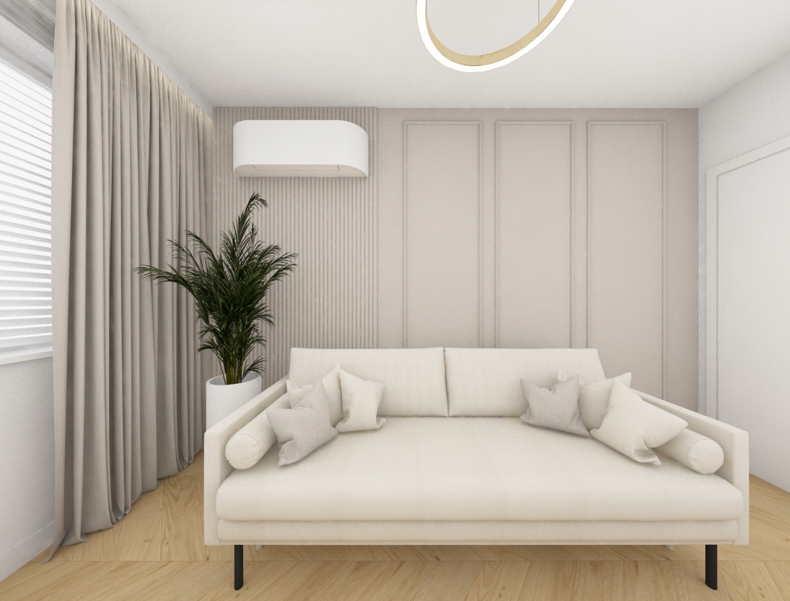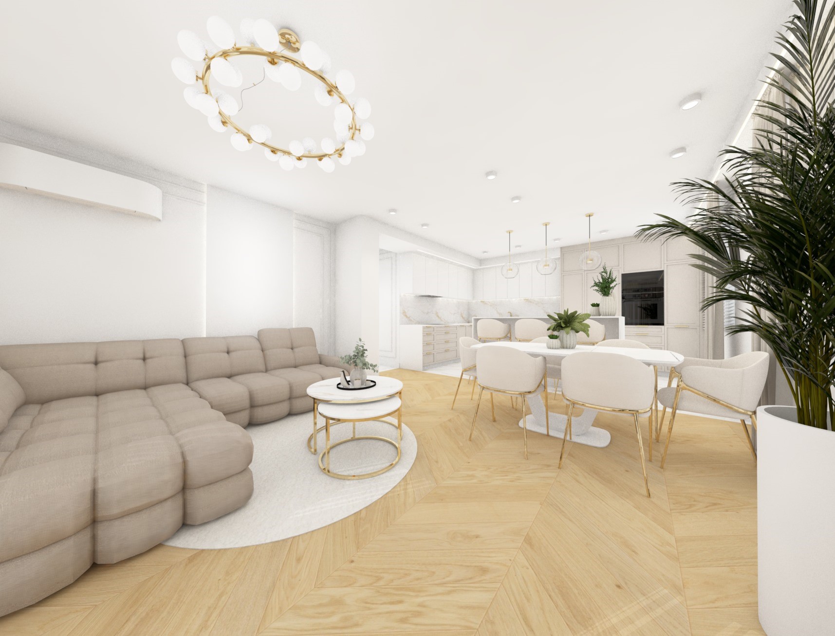 Projekt przestrzenni dziennej w beżach z dodatkiem złota