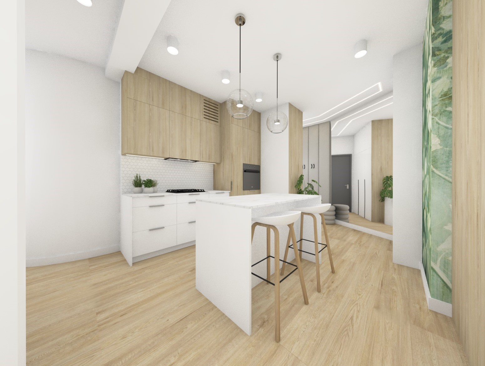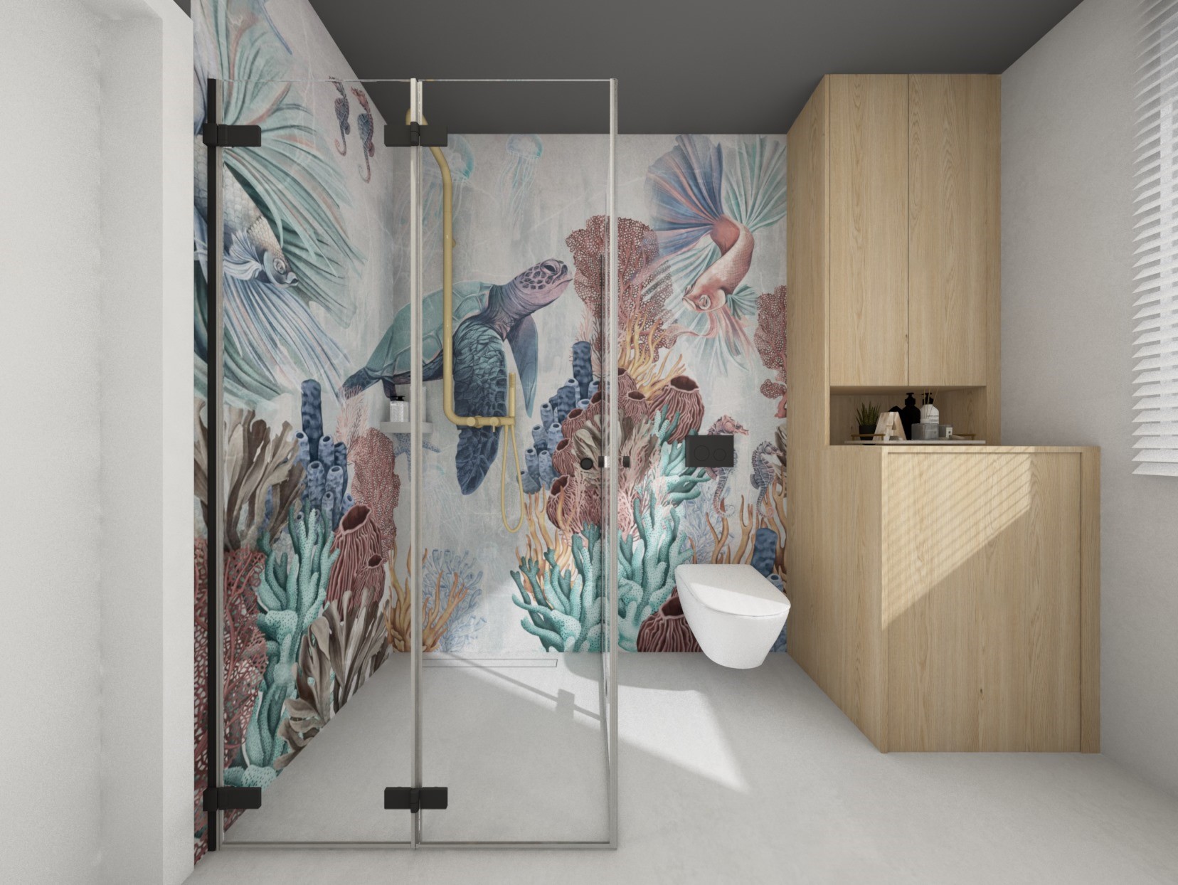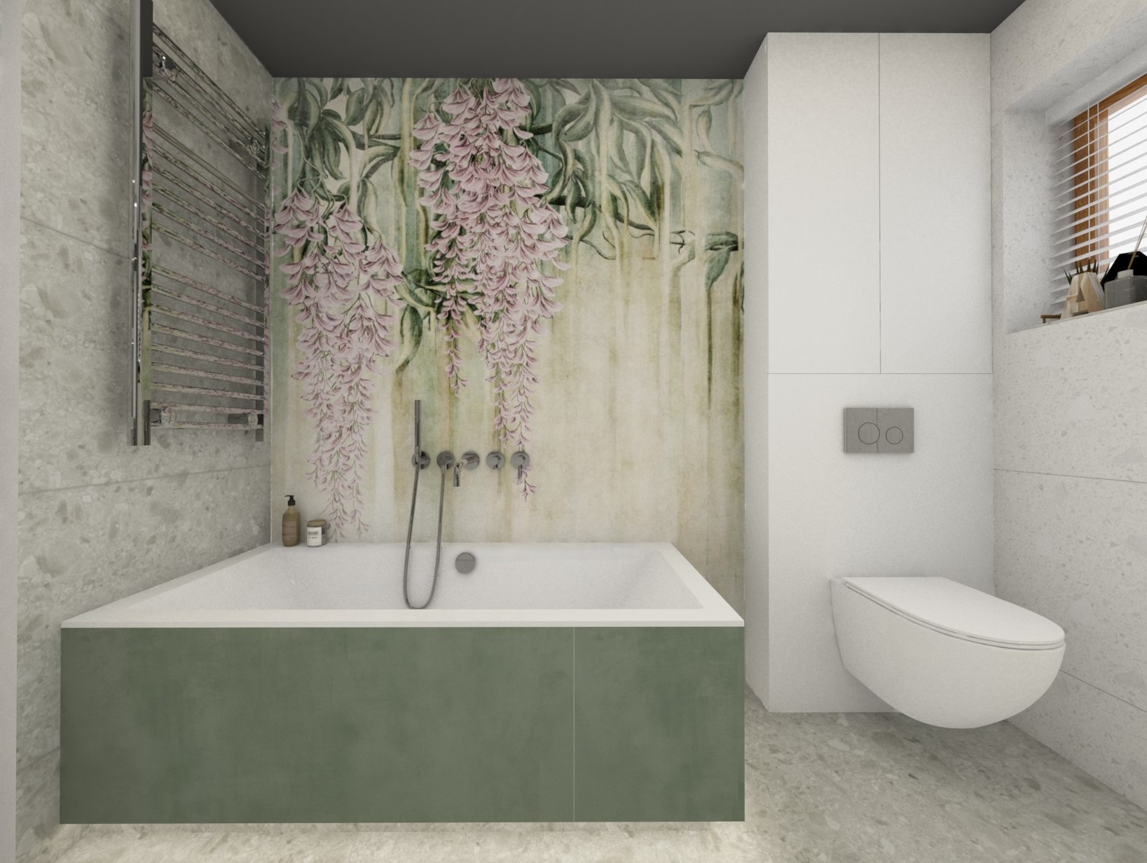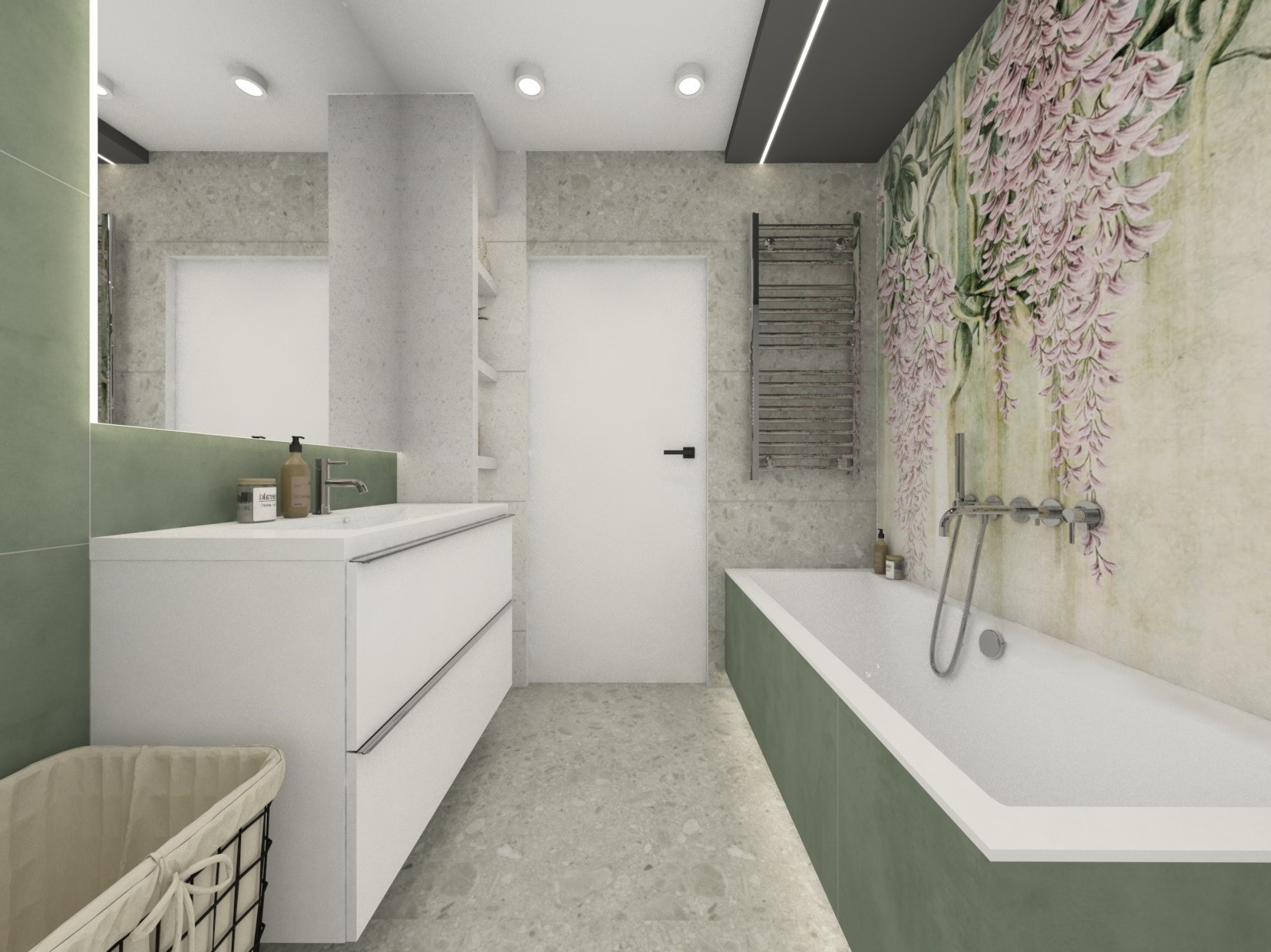 Dalszy etap projejtu i łazienka z fototapetą z roślinnym motywem