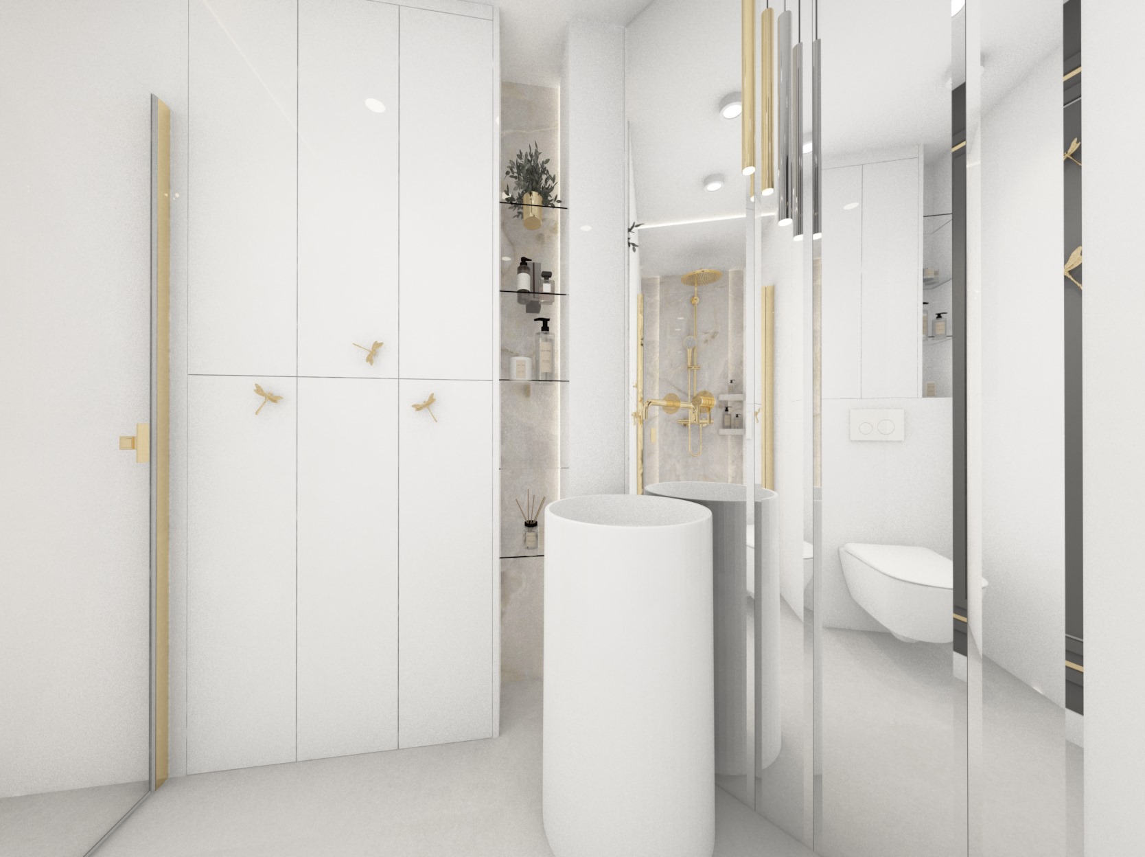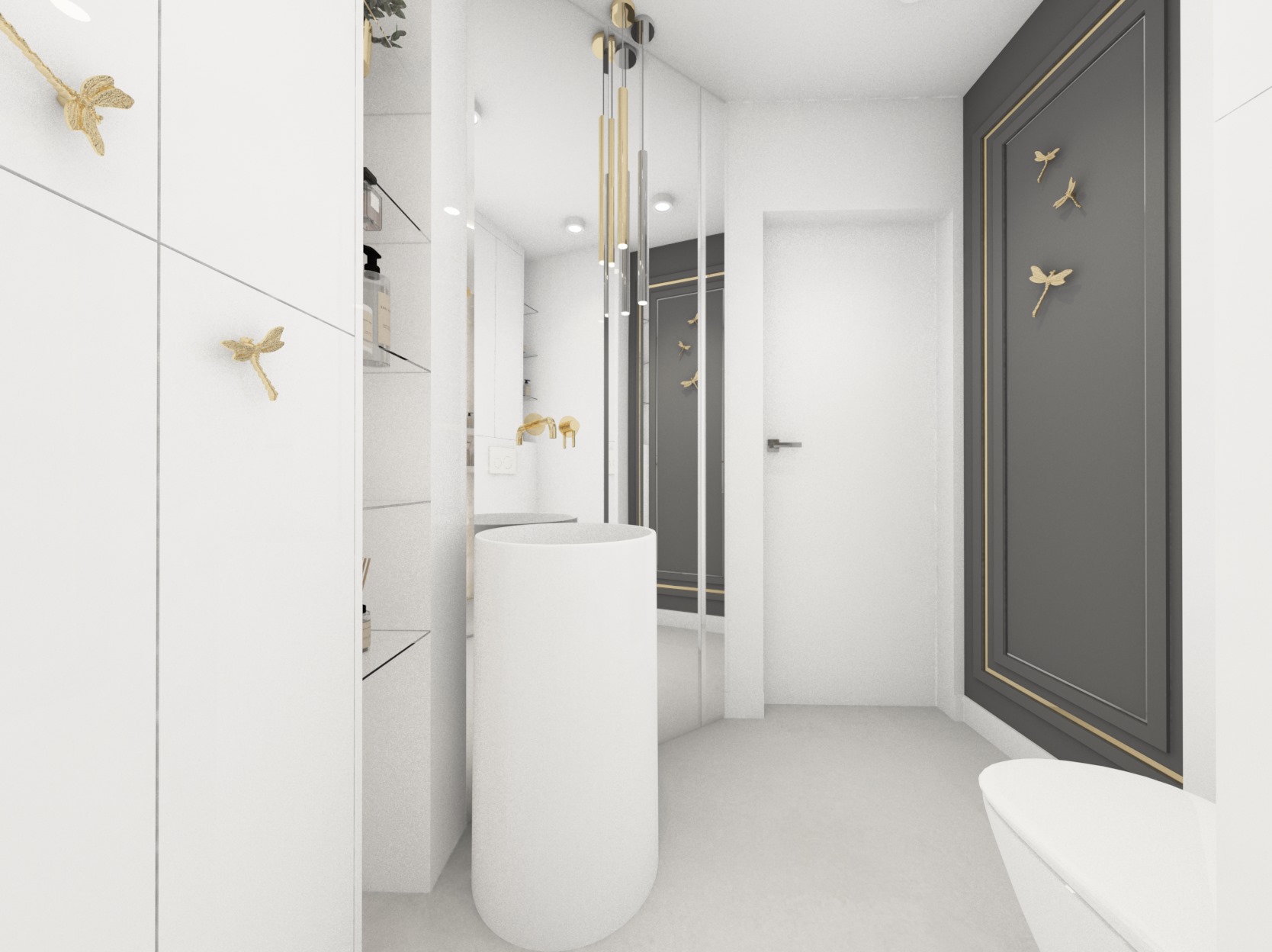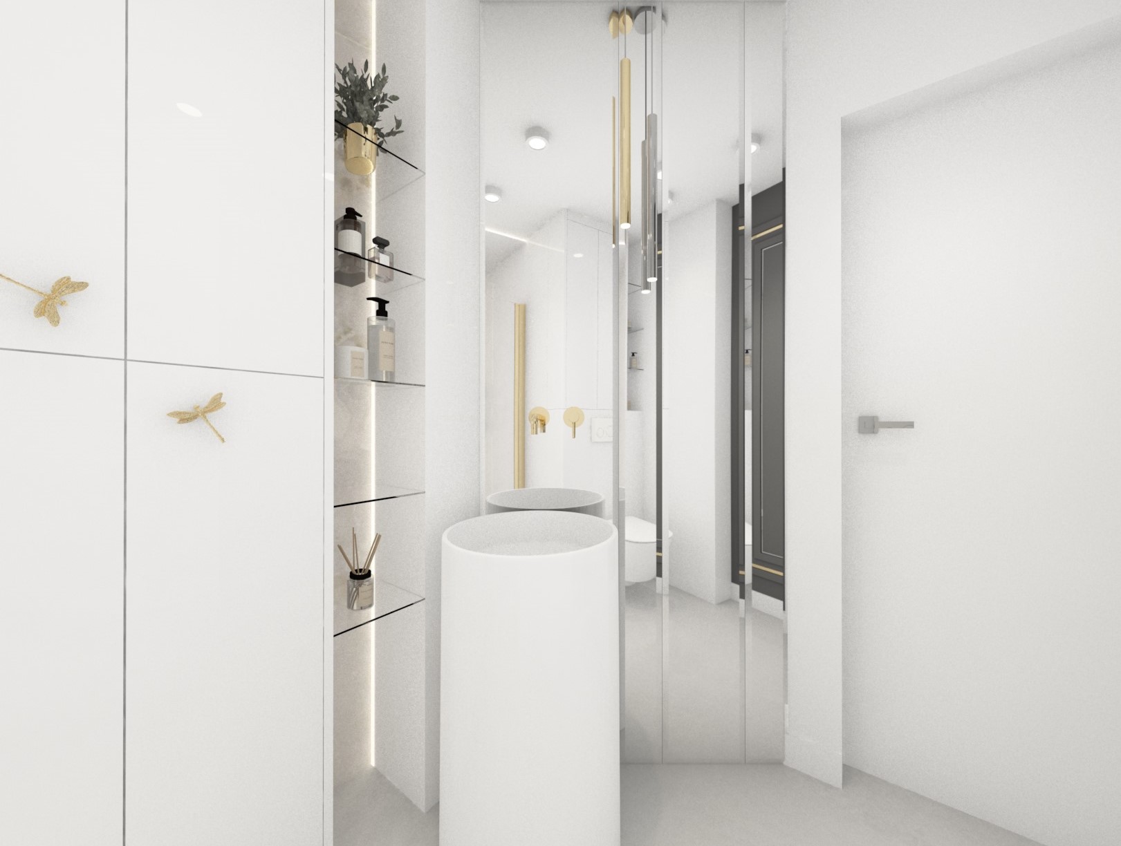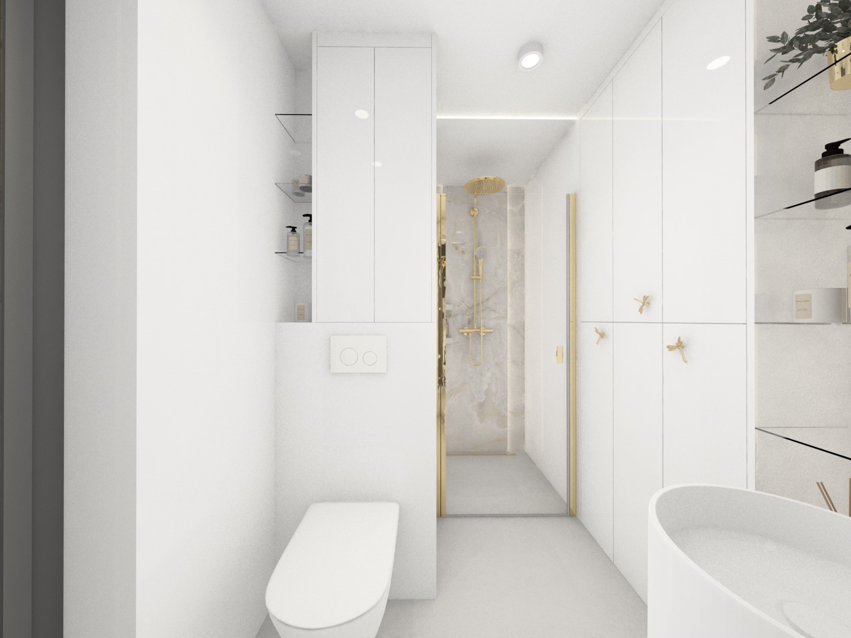 Projekt mniejszej łazienki z dodatkiem złota i srebra