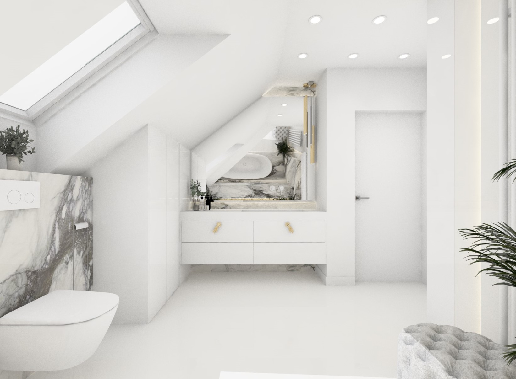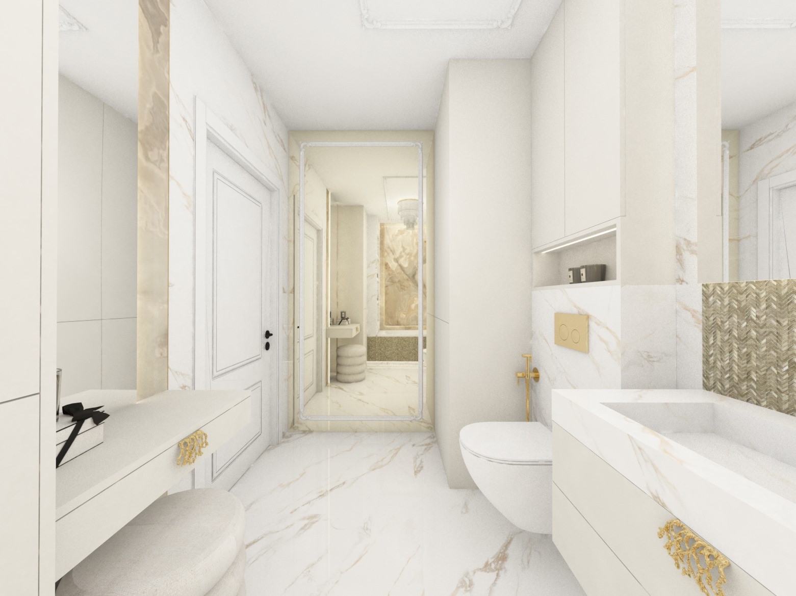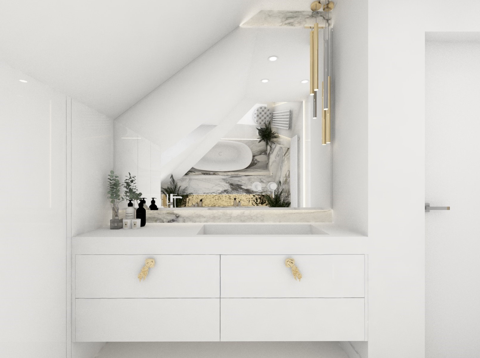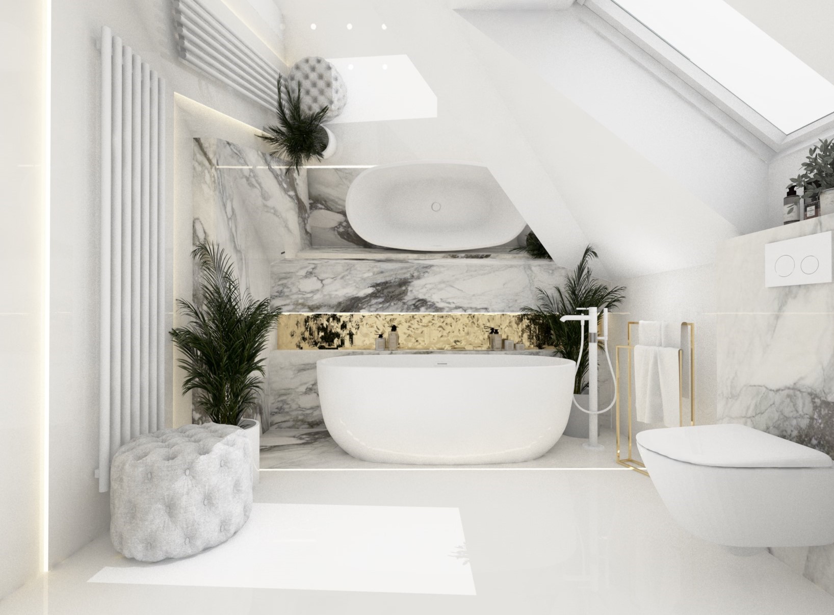 Projekt mniejszej łazienki z dodatkiem złota i srebra